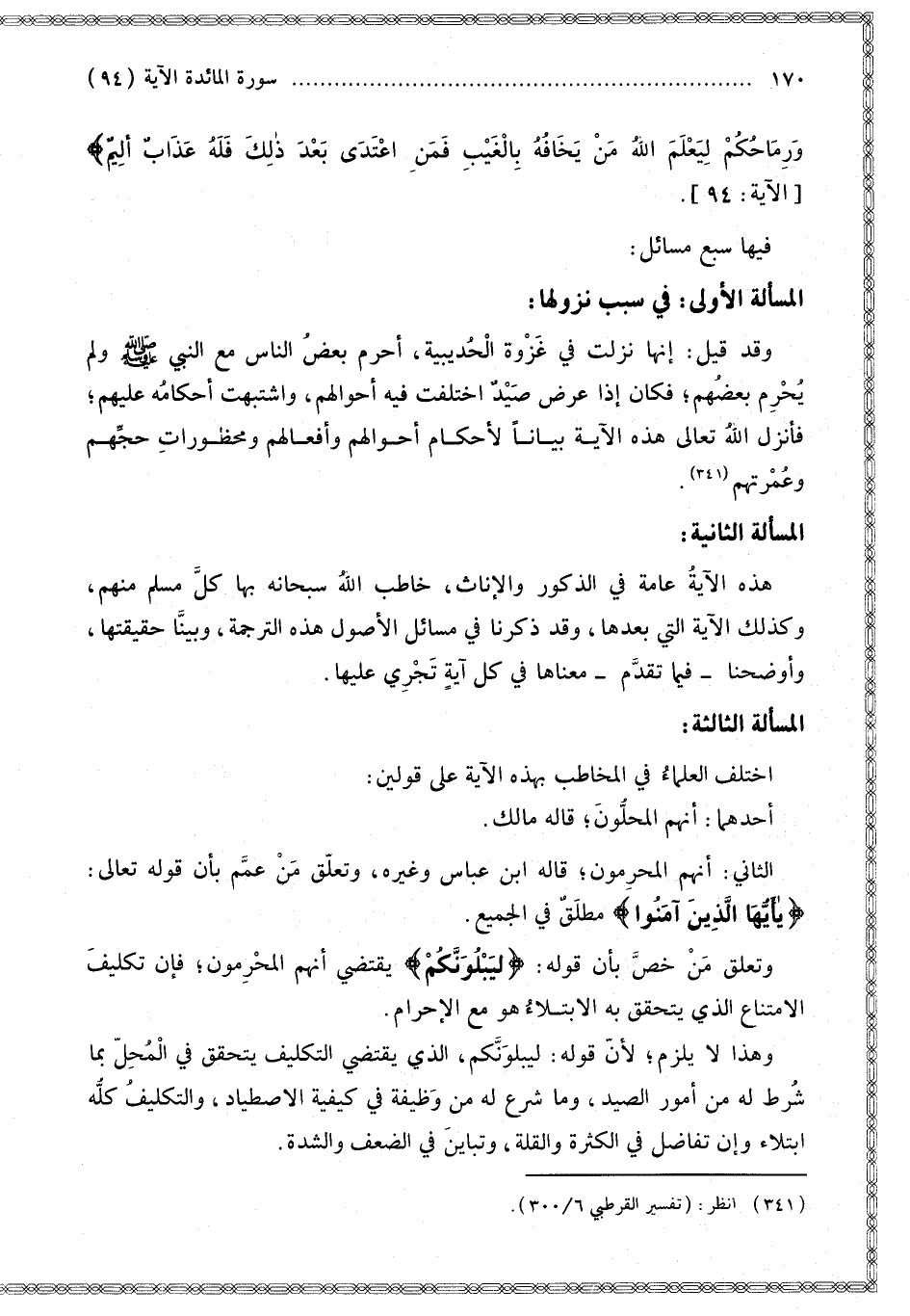 الْمَسْأَلَةُ الْأُولَى: فِي سَبَبِ نُزُولِهَا: وَقَدْ قِيلَ: إنَّهَا نَزَلَتْ فِي غَزْوَةِ الْحُدَيْبِيَةِ، أَحْرَمَ بَعْضُ النَّاسِ مَعَ النَّبِيِّ - صَلَّى اللَّهُ عَلَيْهِ وَسَلَّمَ - وَلَمْ يُحْرِمْ بَعْضُهُمْ فَكَانَ إذَا عَرَضَ صَيْدٌ اخْتَلَفَتْ فِيهِ أَحْوَالُهُمْ، وَاشْتَبَهَتْ أَحْكَامُهُ عَلَيْهِمْ؛ فَأَنْزَلَ اللَّهُ تَعَالَى هَذِهِ الْآيَةَ بَيَانًا لِأَحْكَامِ أَحْوَالِهِمْ وَأَفْعَالِهِمْ وَمَحْظُورَاتِ حَجِّهِمْ وَعُمْرَتِهِمْ.