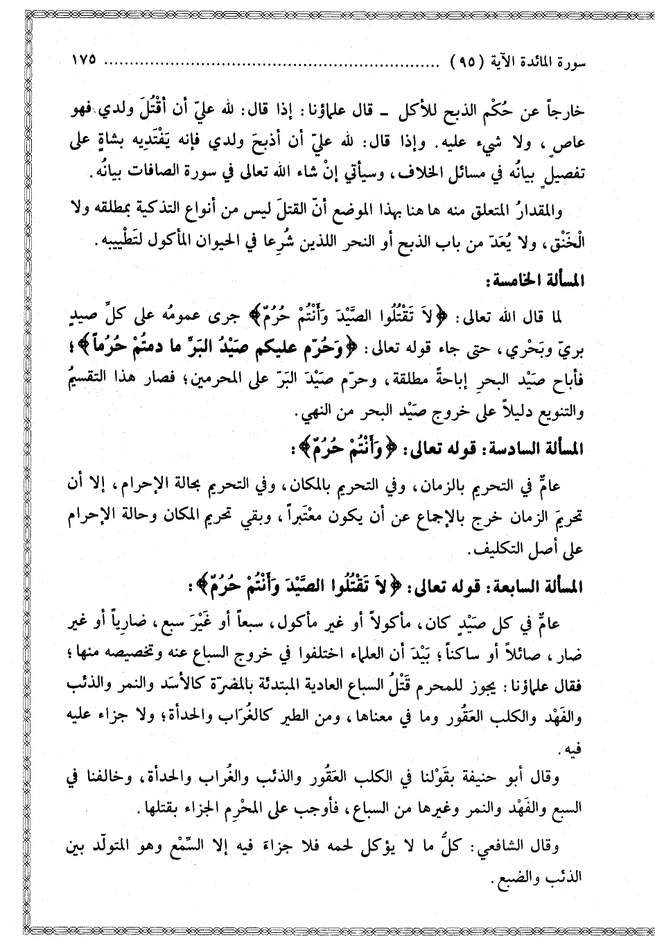 عَامٌّ فِي كُلِّ صَيْدٍ كَانَ، مَأْكُولًا أَوْ غَيْرَ مَأْكُولٍ، سَبُعًا أَوْ غَيْرَ سَبُعٍ، ضَارِيًا أَوْ غَيْرَ ضَارٍ، صَائِلًا أَوْ سَاكِنًا؛ بَيْدَ أَنَّ الْعُلَمَاءَ اخْتَلَفُوا فِي خُرُوجِ السِّبَاعِ عَنْهُ وَتَخْصِيصِهِ مِنْهَا؛ فَقَالَ عُلَمَاؤُنَا: يَجُوزُ لِلْمُحْرِمِ قَتْلُ السِّبَاعِ الْعَادِيَةِ الْمُبْتَدِئَةِ بِالْمَضَرَّةِ كَالْأَسَدِ وَالنَّمِرِ وَالذِّئْبِ وَالْفَهْدِ وَالْكَلْبِ الْعَقُورِ وَمَا فِي مَعْنَاهَا، وَمِنْ الطَّيْرِ كَالْغُرَابِ وَالْحَدَأَةِ؛ وَلَا جَزَاءَ عَلَيْهِ فِيهِ.