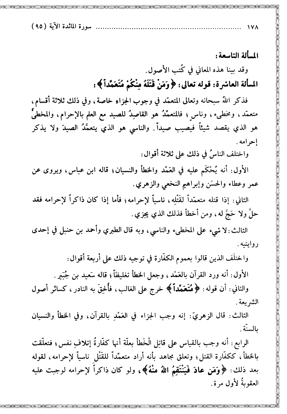 الْمَسْأَلَةُ الْعَاشِرَةُ: قَوْله تَعَالَى: {وَمَنْ قَتَلَهُ مِنْكُمْ مُتَعَمِّدًا} [المائدة: 95] فَذَكَرَ اللَّهُ سُبْحَانَهُ وَتَعَالَى الْمُتَعَمِّدَ فِي وُجُوبِ الْجَزَاءِ خَاصَّةً، وَفِي ذَلِكَ ثَلَاثَةُ أَقْسَامٍ، مُتَعَمِّدٌ، وَمُخْطِئٌ، وَنَاسٍ؛ فَالْمُتَعَمِّدُ هُوَ الْقَاصِدُ لِلصَّيْدِ مَعَ الْعِلْمِ بِالْإِحْرَامِ، وَالْمُخْطِئُ هُوَ الَّذِي يَقْصِدُ شَيْئًا فَيُصِيبُ صَيْدًا. وَالنَّاسِي هُوَ الَّذِي يَتَعَمَّدُ الصَّيْدَ وَلَا يَذْكُرُ إحْرَامَهُ. وَاخْتَلَفَ النَّاسُ فِي ذَلِكَ عَلَى ثَلَاثَةِ أَقْوَالٍ: