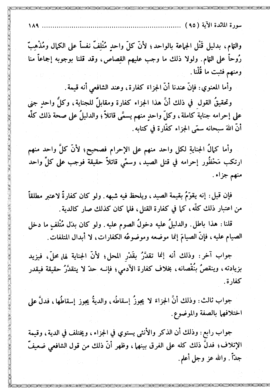 جَوَابٌ رَابِعُ: وَذَلِكَ أَنَّ الذَّكَرَ وَالْأُنْثَى يَسْتَوِي فِي الْجَزَاءِ، وَيَخْتَلِفُ فِي الدِّيَةِ، وَقِيمَةِ الْإِتْلَافِ؛ فَدَلَّ ذَلِكَ كُلُّهُ عَلَى الْفَرْقِ بَيْنَهُمَا، وَظَهَرَ أَنَّ ذَلِكَ مِنْ قَوْلِ الشَّافِعِيِّ ضَعِيفٌ جِدًّا. وَاَللَّهُ عَزَّ وَجَلَّ أَعْلَمُ.