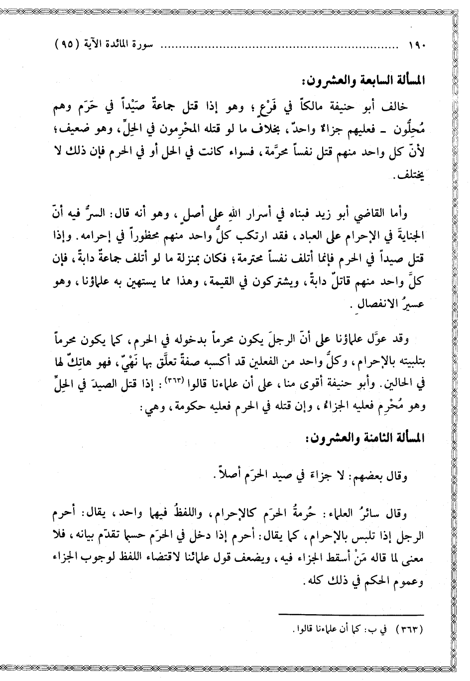 وَأَمَّا الْقَاضِي أَبُو زَيْدٍ فَبَنَاهُ فِي أَسْرَارِ اللَّهِ عَلَى أَصْلٍ، وَهُوَ أَنَّهُ قَالَ: السِّرُّ فِيهِ أَنَّ الْجِنَايَةَ فِي الْإِحْرَامِ عَلَى الْعِبَادِ، فَقَدْ ارْتَكَبَ كُلُّ وَاحِدٍ مِنْهُمْ مَحْظُورًا فِي إحْرَامِهِ. وَإِذَا قَتَلَ صَيْدًا فِي الْحَرَمِ فَإِنَّمَا أَتْلَفَ نَفْسًا مُحْتَرَمَةً فَكَانَ بِمَنْزِلَةِ مَا لَوْ أَتْلَفَ جَمَاعَةٌ دَابَّةً، فَإِنَّ كُلَّ وَاحِدٍ مِنْهُمْ قَاتِلٌ دَابَّةً، وَيَشْتَرِكُونَ فِي الْقِيمَةِ، وَهَذَا مِمَّا يَسْتَهِينُ بِهِ عُلَمَاؤُنَا، وَهُوَ عَسِيرُ الِانْفِصَالِ.