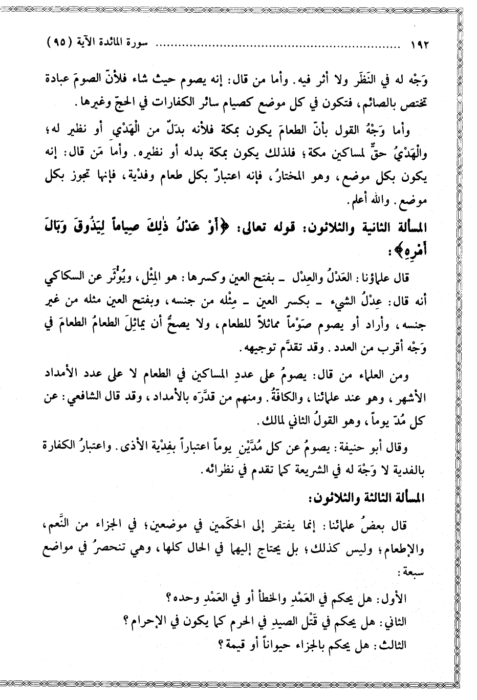 الْمَسْأَلَةُ الثَّانِيَةُ وَالثَّلَاثُونَ: قَوْله تَعَالَى: {أَوْ عَدْلُ ذَلِكَ صِيَامًا لِيَذُوقَ وَبَالَ أَمْرِهِ} [المائدة: 95]
