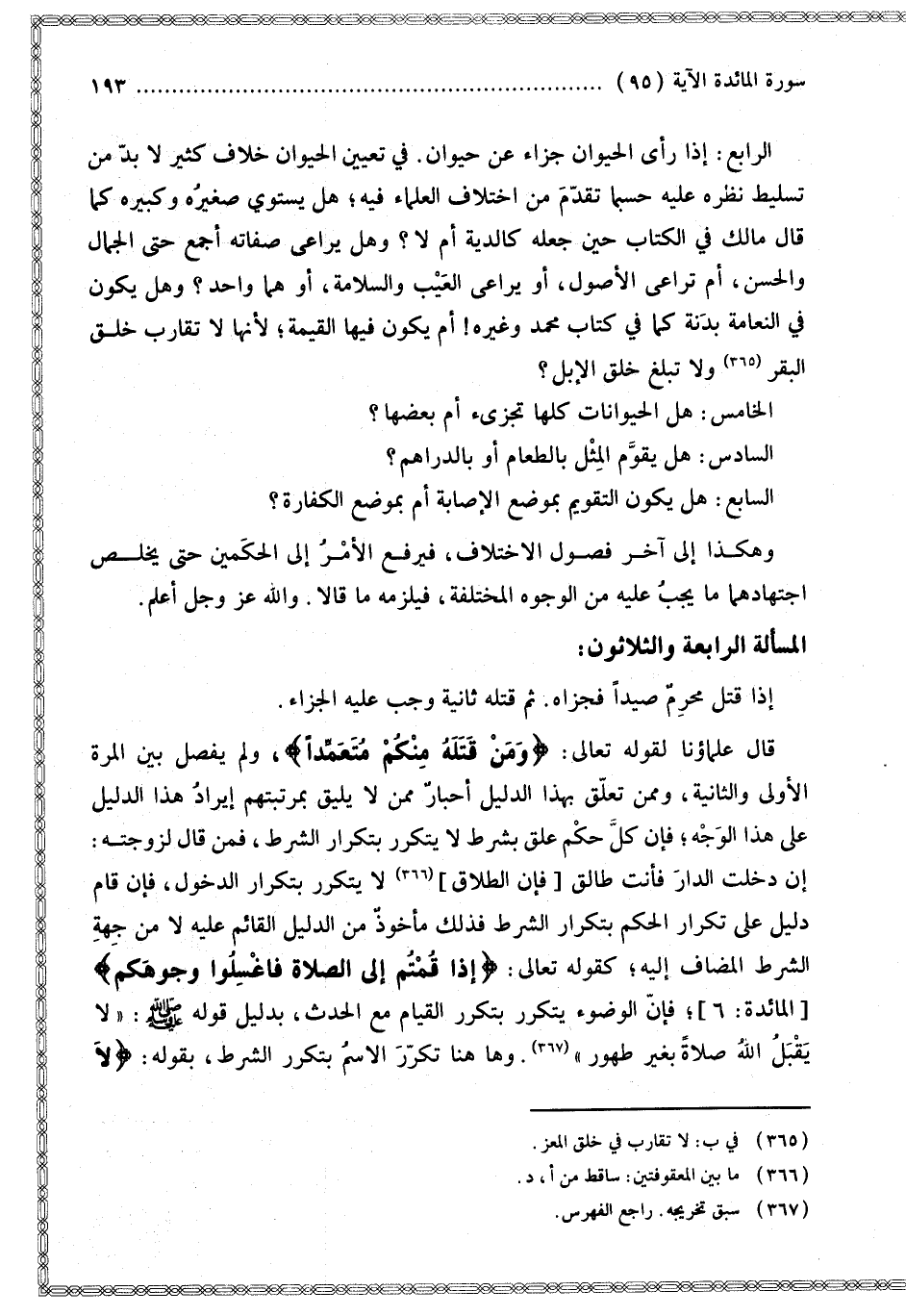 إذَا قَتَلَ مُحْرِمٌ صَيْدًا فَجَزَاهُ. ثُمَّ قَتَلَهُ ثَانِيَةً وَجَبَ عَلَيْهِ الْجَزَاءُ. قَالَ عُلَمَاؤُنَا لِقَوْلِهِ تَعَالَى: {وَمَنْ قَتَلَهُ مِنْكُمْ مُتَعَمِّدًا} [المائدة: 95]، وَلَمْ يَفْصِلْ بَيْنَ الْمَرَّةِ الْأُولَى وَالثَّانِيَةِ، وَمِمَّنْ تَعَلَّقَ بِهَذَا الدَّلِيلِ أَحْبَارٌ مِمَّنْ لَا يَلِيقُ بِمَرْتَبَتِهِمْ إيرَادُ هَذَا الدَّلِيلِ عَلَى هَذَا الْوَجْهِ؛ فَإِنَّ كُلَّ حُكْمٍ عُلِّقَ بِشَرْطٍ لَا يَتَكَرَّرُ بِتَكْرَارِ الشَّرْطِ، فَمَنْ قَالَ لِزَوْجَتِهِ: إنْ دَخَلْت الدَّارَ فَأَنْتِ طَالِقٌ [فَإِنَّ الطَّلَاقَ] لَا يَتَكَرَّرُ بِتَكْرَارِ الدُّخُولِ، فَإِنْ قَامَ دَلِيلٌ عَلَى تَكْرَارِ الْحُكْمِ بِتَكْرَارِ الشَّرْطِ فَذَلِكَ مَأْخُوذٌ مِنْ الدَّلِيلِ الْقَائِمِ عَلَيْهِ لَا مِنْ جِهَةِ الشَّرْطِ الْمُضَافِ إلَيْهِ؛ كَقَوْلِهِ تَعَالَى: {إِذَا قُمْتُمْ إِلَى الصَّلاةِ فَاغْسِلُوا وُجُوهَكُمْ} [المائدة: 6] فَإِنَّ الْوُضُوءَ يَتَكَرَّرُ بِتَكَرُّرِ الْقِيَامِ مَعَ الْحَدَثِ، بِدَلِيلِ قَوْلِهِ - صَلَّى اللَّهُ عَلَيْهِ وَسَلَّمَ -: «لَا يَقْبَلُ اللَّهُ صَلَاةً بِغَيْرِ طُهُورٍ». وَهَا هُنَا تَكَرَّرَ الِاسْمُ بِتَكَرُّرِ الشَّرْطِ، بِقَوْلِهِ: {لا تَقْتُلُوا الصَّيْدَ وَأَنْتُمْ حُرُمٌ وَمَنْ قَتَلَهُ مِنْكُمْ مُتَعَمِّدًا فَجَزَاءٌ مِثْلُ مَا قَتَلَ مِنَ النَّعَمِ} [المائدة: 95]