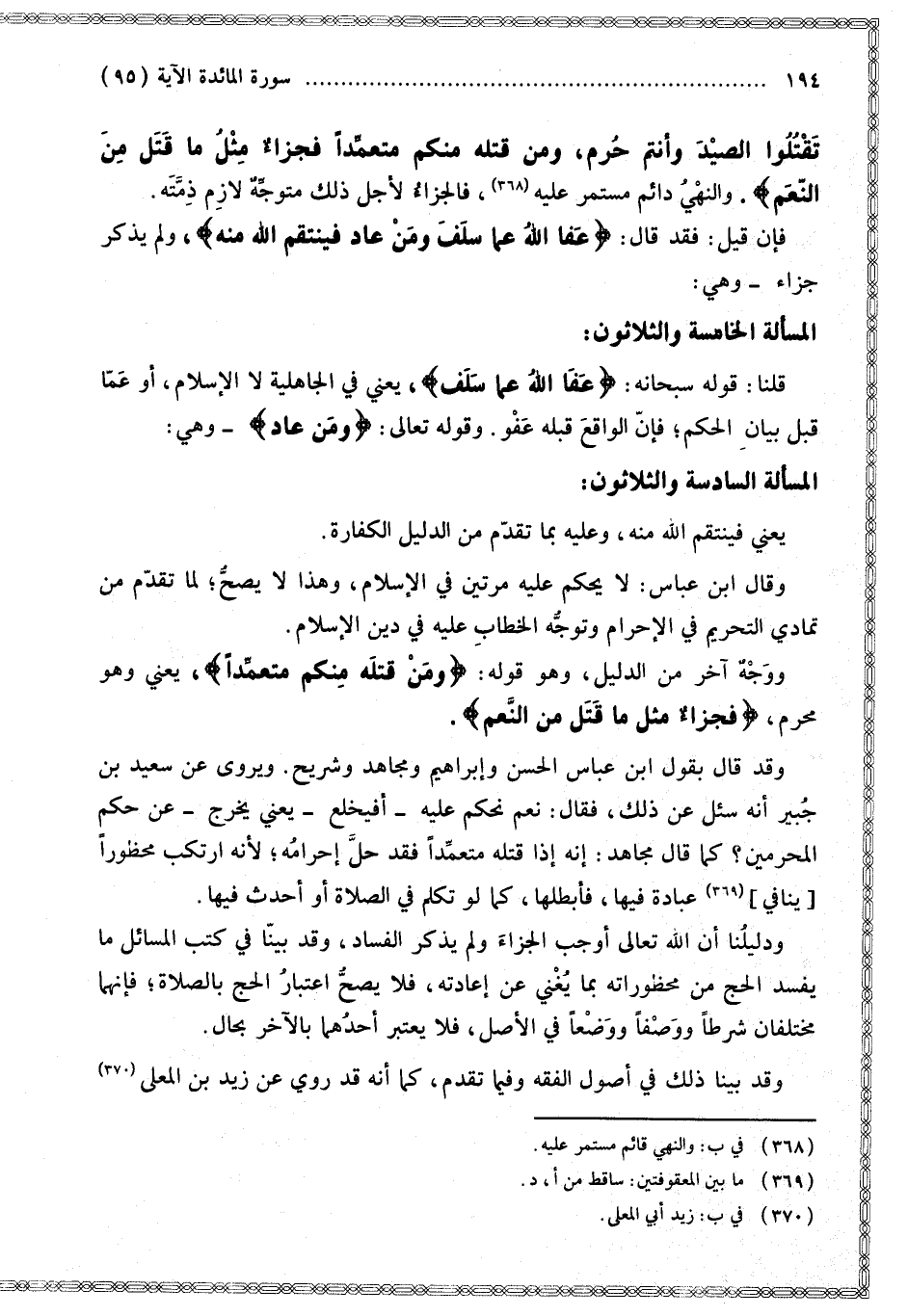 الْمَسْأَلَةُ الْخَامِسَةُ وَالثَّلَاثُونَ: قُلْنَا: قَوْلُهُ سُبْحَانَهُ: {عَفَا اللَّهُ عَمَّا سَلَفَ} [المائدة: 95] يَعْنِي فِي الْجَاهِلِيَّةِ لَا الْإِسْلَامِ، أَوْ عَمَّا قَبْلَ بَيَانِ الْحُكْمِ؛ فَإِنَّ الْوَاقِعَ قَبْلَهُ عَفْوٌ. وقَوْله تَعَالَى: {وَمَنْ عَادَ} [المائدة: 95] وَهِيَ: