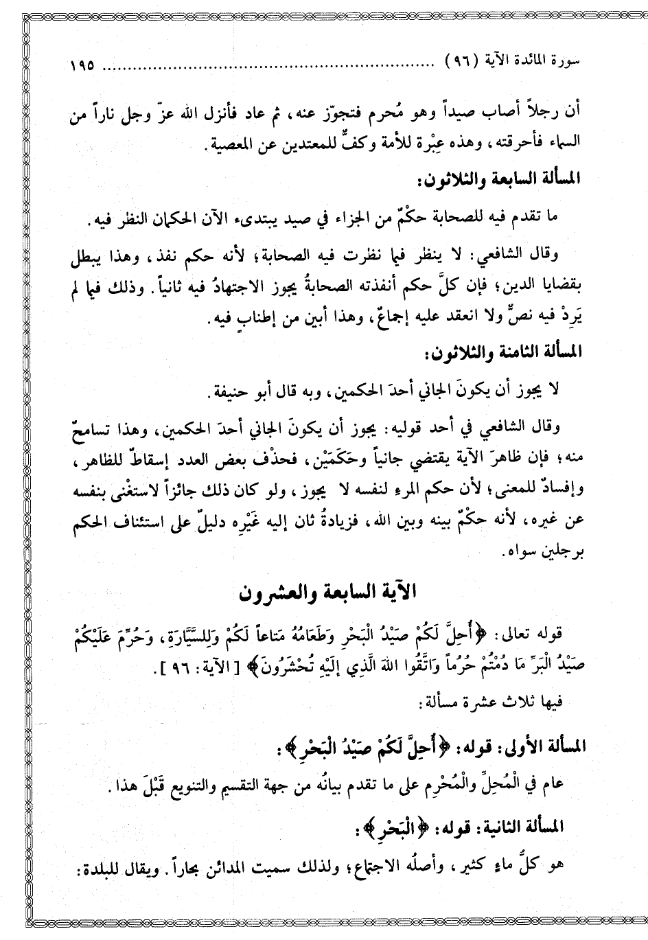 قَوْله تَعَالَى: {أُحِلَّ لَكُمْ صَيْدُ الْبَحْرِ وَطَعَامُهُ مَتَاعًا لَكُمْ وَلِلسَّيَّارَةِ وَحُرِّمَ عَلَيْكُمْ صَيْدُ الْبَرِّ مَا دُمْتُمْ حُرُمًا وَاتَّقُوا اللَّهَ الَّذِي إِلَيْهِ تُحْشَرُونَ} [المائدة: 96].