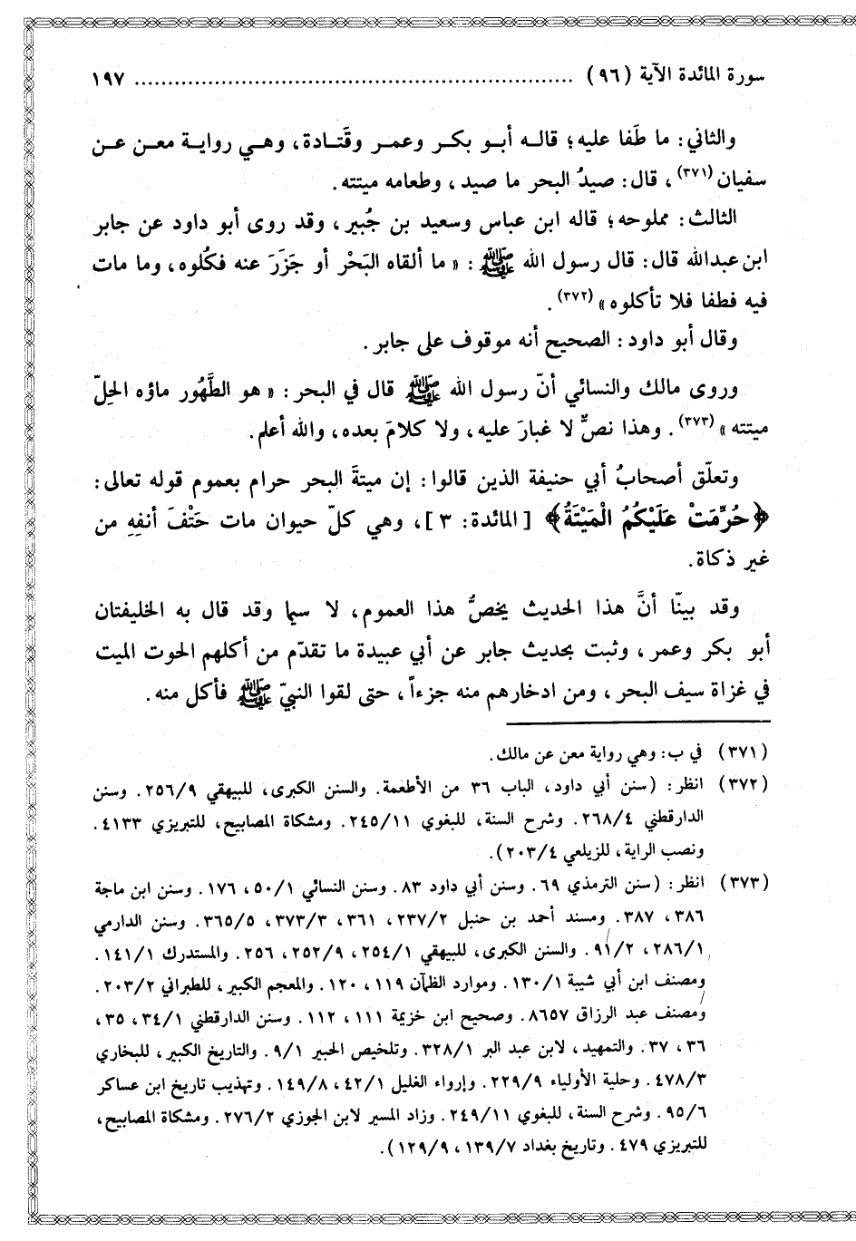 وَقَدْ بَيَّنَّا أَنَّ هَذَا الْحَدِيثَ يَخُصُّ هَذَا الْعُمُومَ، لَا سِيَّمَا وَقَدْ قَالَ بِهِ الْخَلِيفَتَانِ أَبُو بَكْرٍ وَعُمَرُ، وَثَبَتَ بِحَدِيثِ جَابِرٍ «عَنْ أَبِي عُبَيْدَةَ مَا تَقَدَّمَ مِنْ أَكْلِهِمْ الْحُوتَ الْمَيِّتَ فِي غُزَاةِ سَيْفِ الْبَحْرِ، وَمِنْ ادِّخَارِهِمْ مِنْهُ جُزْءًا، حَتَّى لَقُوا النَّبِيَّ - صَلَّى اللَّهُ عَلَيْهِ وَسَلَّمَ - فَأَكَلَ مِنْهُ».