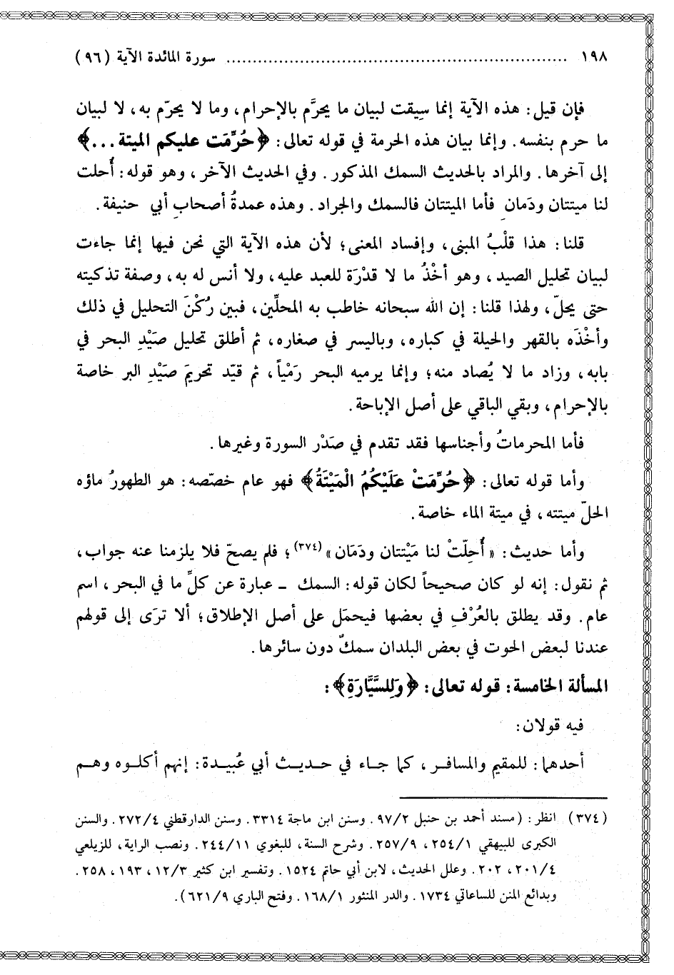 وَأَمَّا قَوْله تَعَالَى: {حُرِّمَتْ عَلَيْكُمُ الْمَيْتَةُ} [المائدة: 3] فَهُوَ عَامٌّ خَصَّصَهُ: هُوَ الطَّهُورُ مَاؤُهُ الْحِلُّ مَيْتَتُهُ، فِي مَيْتَةِ الْمَاءِ خَاصَّةً.