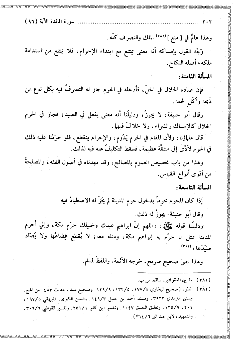 الْمَسْأَلَةُ التَّاسِعَةُ: إذَا كَانَ الْمُحْرِمُ مُحْرِمًا بِدُخُولِ حَرَمِ الْمَدِينَةِ لَمْ يَجُزْ لَهُ الِاصْطِيَادُ فِيهِ.