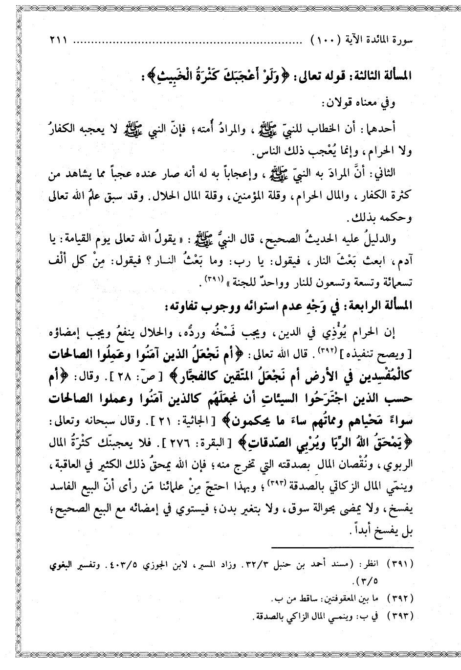 الْمَسْأَلَةُ الرَّابِعَةُ: فِي وَجْهِ عَدَمِ اسْتِوَائِهِ وَوُجُوبِ تَفَاوُتِهِ: إنَّ الْحَرَامَ يُؤْذِي فِي الدِّينِ، وَيَجِبُ فَسْخُهُ وَرَدُّهُ، وَالْحَلَالُ يَنْفَعُ وَيَجِبُ إمْضَاؤُهُ [وَيَصِحُّ تَنْفِيذُهُ]. قَالَ اللَّهُ تَعَالَى: {أَمْ نَجْعَلُ الَّذِينَ آمَنُوا وَعَمِلُوا الصَّالِحَاتِ كَالْمُفْسِدِينَ فِي الأَرْضِ أَمْ نَجْعَلُ الْمُتَّقِينَ كَالْفُجَّارِ} [ص: 28]. وَقَالَ: {أَمْ حَسِبَ الَّذِينَ اجْتَرَحُوا السَّيِّئَاتِ أَنْ نَجْعَلَهُمْ كَالَّذِينَ آمَنُوا وَعَمِلُوا الصَّالِحَاتِ سَوَاءً مَحْيَاهُمْ وَمَمَاتُهُمْ سَاءَ مَا يَحْكُمُونَ} [الجاثية: 21] وَقَالَ سُبْحَانَهُ وَتَعَالَى: {يَمْحَقُ اللَّهُ الرِّبَا وَيُرْبِي الصَّدَقَاتِ} [البقرة: 276]. فَلَا يُعْجِبَنَّكَ كَثْرَةُ الْمَالِ الرِّبَوِيِّ، وَنُقْصَانُ الْمَالِ بِصَدَقَتِهِ الَّتِي تَخْرُجُ مِنْهُ؛ فَإِنَّ اللَّهَ يَمْحَقُ ذَلِكَ الْكَثِيرَ فِي الْعَاقِبَةِ، وَيُنَمِّي الْمَالَ الزَّكَاتِيَّ بِالصَّدَقَةِ؛ وَبِهَذَا احْتَجَّ مِنْ عُلَمَائِنَا مَنْ رَأَى أَنَّ الْبَيْعَ الْفَاسِدَ يُفْسَخُ، وَلَا يُمْضَى بِحَوَالَةِ سُوقٍ، وَلَا بِتَغَيُّرِ بَدَنٍ؛ فَيَسْتَوِي فِي إمْضَائِهِ مَعَ الْبَيْعِ الصَّحِيحِ؛ بَلْ يُفْسَخُ أَبَدًا.