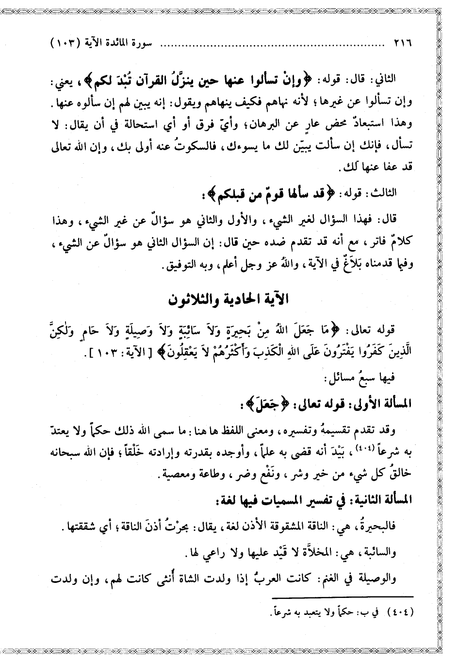 [الْآيَة الْحَادِيَة وَالثَّلَاثُونَ قَوْله تَعَالَى مَا جَعَلَ اللَّهُ مِنْ بَحِيرَةٍ وَلَا سَائِبَةٍ وَلَا وَصِيلَةٍ]