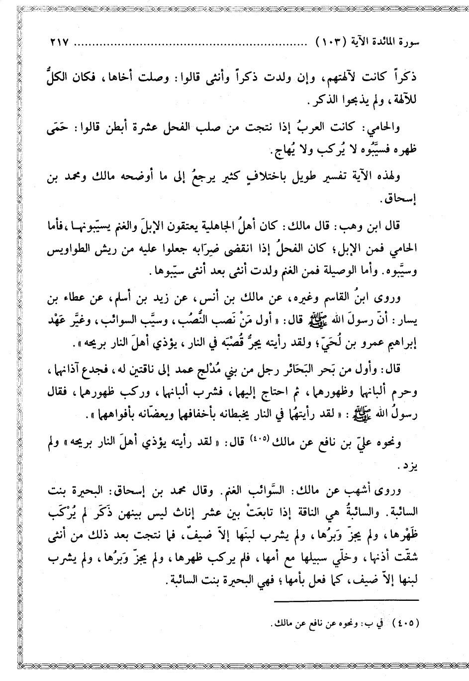 قَالَ ابْنُ وَهْبٍ: قَالَ مَالِكٌ: كَانَ أَهْلُ الْجَاهِلِيَّةِ يُعْتِقُونَ الْإِبِلَ وَالْغَنَمَ يُسَيِّبُونَهَا، فَأَمَّا الْحَامِي فَمِنْ الْإِبِلِ؛ كَانَ الْفَحْلُ إذَا انْقَضَى ضِرَابُهُ جَعَلُوا عَلَيْهِ مِنْ رِيشِ الطَّوَاوِيسِ وَسَيَّبُوهُ.