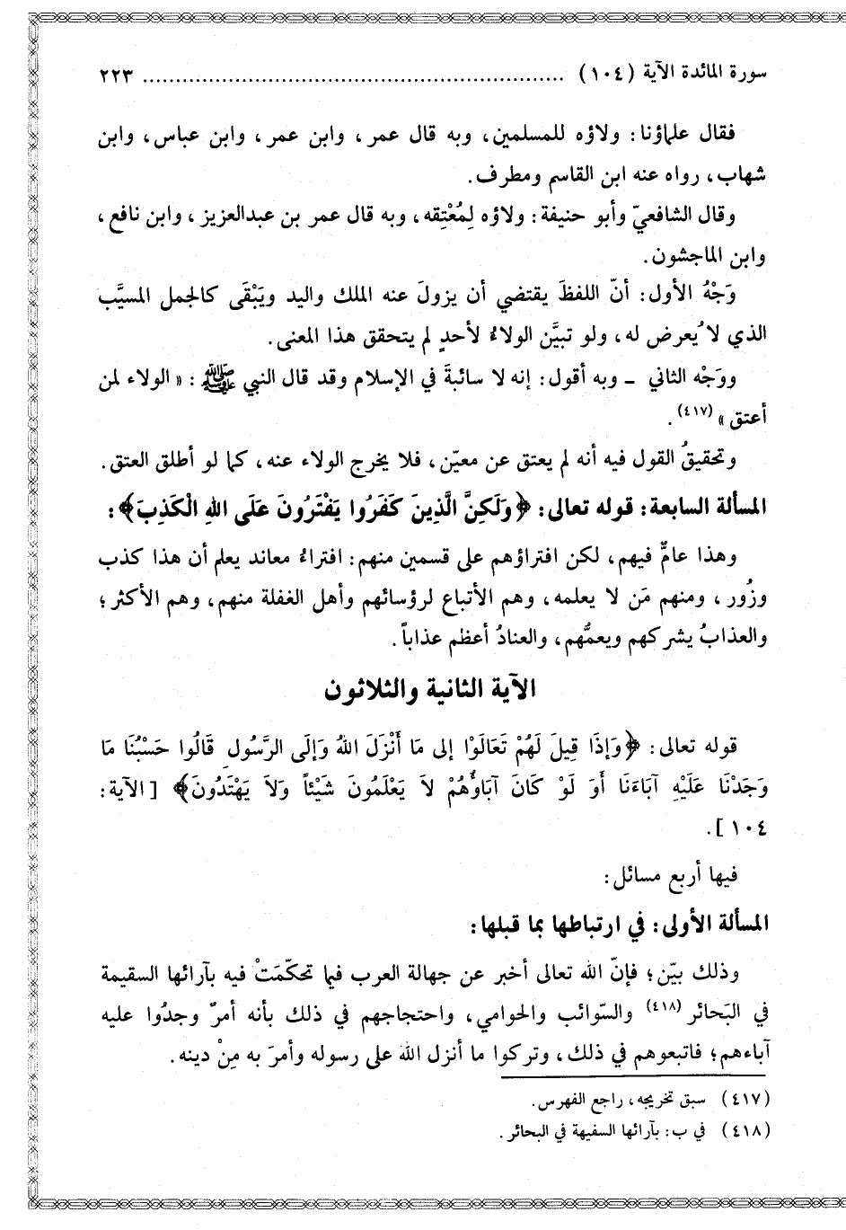 الْمَسْأَلَةُ السَّابِعَةُ: قَوْله تَعَالَى: {وَلَكِنَّ الَّذِينَ كَفَرُوا يَفْتَرُونَ عَلَى اللَّهِ الْكَذِبَ} [المائدة: 103]: وَهَذَا عَامٌّ فِيهِمْ، لَكِنْ افْتِرَاؤُهُمْ عَلَى قِسْمَيْنِ مِنْهُمْ: افْتِرَاءُ مُعَانِدٍ يَعْلَمُ أَنَّ هَذَا كَذِبٌ وَزُورٌ، وَمِنْهُمْ مَنْ لَا يَعْلَمُهُ، وَهُمْ الْأَتْبَاعُ لِرُؤَسَائِهِمْ وَأَهْلُ الْغَفْلَةِ مِنْهُمْ، وَهُمْ الْأَكْثَرُ؛ وَالْعَذَابُ يُشْرِكُهُمْ وَيَعُمُّهُمْ، وَالْعِنَادُ أَعْظَمُ عَذَابًا.