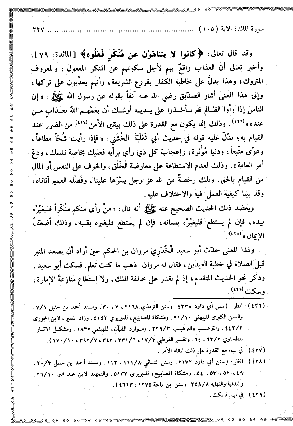 وَيَعْضُدُ ذَلِكَ الْحَدِيثُ الصَّحِيحُ عَنْهُ - صَلَّى اللَّهُ عَلَيْهِ وَسَلَّمَ - أَنَّهُ قَالَ: «مَنْ رَأَى مِنْكُمْ مُنْكَرًا فَلْيُغَيِّرْهُ بِيَدِهِ، فَإِنْ لَمْ يَسْتَطِعْ فَلْيُغَيِّرْهُ بِلِسَانِهِ، فَإِنْ لَمْ يَسْتَطِعْ فَلْيُغَيِّرْهُ بِقَلْبِهِ، وَذَلِكَ أَضْعَفُ الْإِيمَانِ».