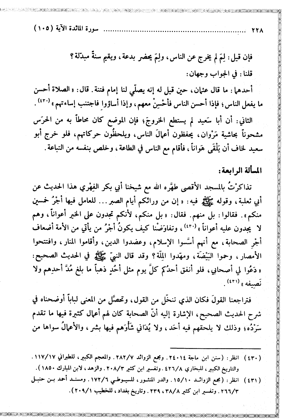 الْمَسْأَلَةُ الرَّابِعَةُ: تَذَاكَرْت بِالْمَسْجِدِ الْأَقْصَى طَهَّرَهُ اللَّهُ مَعَ شَيْخِنَا أَبِي بَكْرٍ الْفِهْرِيِّ هَذَا الْحَدِيثَ عَنْ أَبِي ثَعْلَبَةَ، وَقَوْلُهُ - صَلَّى اللَّهُ عَلَيْهِ وَسَلَّمَ - فِيهِ: «إنَّ مِنْ وَرَائِكُمْ أَيَّامَ الصَّبْرِ لِلْعَامِلِ فِيهَا أَجْرُ خَمْسِينَ مِنْكُمْ. فَقَالُوا: بَلْ مِنْهُمْ. فَقَالَ: بَلْ مِنْكُمْ؛ لِأَنَّكُمْ تَجِدُونَ عَلَى الْخَيْرِ أَعْوَانًا، وَهُمْ لَا يَجِدُونَ عَلَيْهِ أَعْوَانًا»، وَتَفَاوَضْنَا كَيْفَ يَكُونُ أَجْرُ مَنْ يَأْتِي مِنْ الْأُمَّةِ أَضْعَافَ أَجْرِ الصَّحَابَةِ، مَعَ أَنَّهُمْ أَسَّسُوا الْإِسْلَامَ، وَعَضَّدُوا الدِّينَ، وَأَقَامُوا الْمَنَارَ، وَافْتَتَحُوا الْأَمْصَارَ، وَحَمَوْا الْبَيْضَةَ، وَمَهَّدُوا الْمِلَّةَ؟ وَقَدْ قَالَ النَّبِيُّ - صَلَّى اللَّهُ عَلَيْهِ وَسَلَّمَ - فِي الْحَدِيثِ الصَّحِيحِ: «دَعُوا لِي أَصْحَابِي، فَلَوْ أَنْفَقَ أَحَدُكُمْ كُلَّ يَوْمٍ مِثْلَ أُحُدٍ ذَهَبًا مَا بَلَغَ مُدَّ أَحَدِهِمْ وَلَا نَصِيفَهُ».