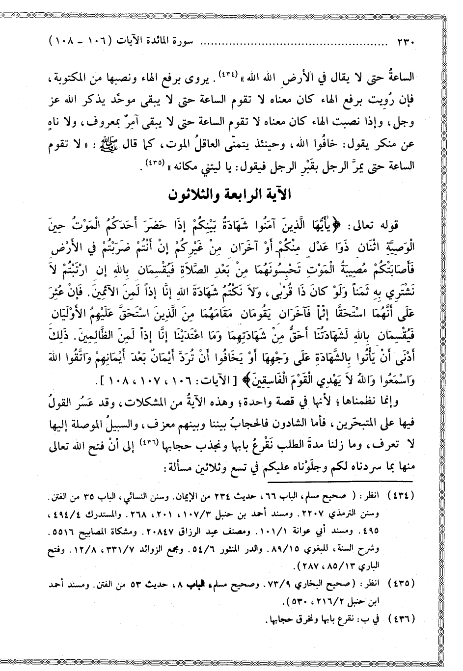 [الْآيَة الرَّابِعَة وَالثَّلَاثُونَ قَوْله تَعَالَى يَأَيُّهَا الَّذِينَ آمَنُوا شَهَادَةُ بَيْنِكُمْ]