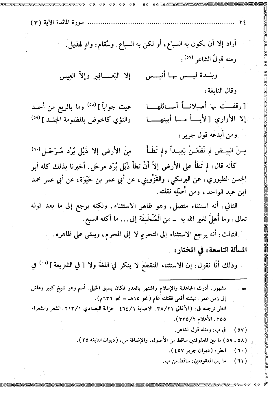 الثَّالِثُ: أَنَّهُ يَرْجِعُ الِاسْتِثْنَاءُ إلَى التَّحْرِيمِ لَا إلَى الْمُحَرَّمِ، وَيَبْقَى عَلَى ظَاهِرِهِ. الْمَسْأَلَةُ التَّاسِعَةُ: فِي الْمُخْتَارِ: وَذَلِكَ أَنَّا نَقُولُ: إنَّ الِاسْتِثْنَاءَ الْمُنْقَطِعَ لَا يُنْكَرُ فِي اللُّغَةِ وَلَا [فِي الشَّرِيعَةِ] فِي