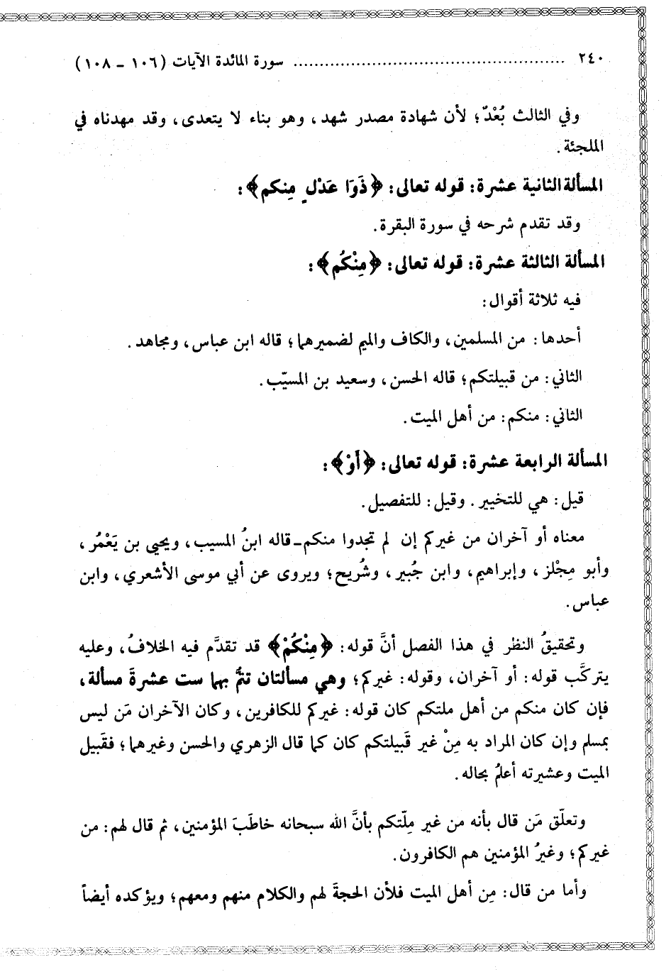 الْمَسْأَلَةُ الثَّالِثَةَ عَشْرَةَ: قَوْله تَعَالَى: {مِنْكُمْ} [المائدة: 106] فِيهِ ثَلَاثَةُ أَقْوَالٍ: