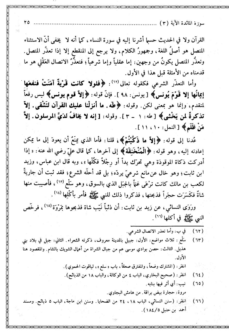وَقَوْلَهُ: {إِنِّي لا يَخَافُ لَدَيَّ الْمُرْسَلُونَ} [النمل: 10] {إِلا مَنْ ظَلَمَ} [النمل: 11]. عُدْنَا إلَى قَوْلِهِ: {إِلا مَا ذَكَّيْتُمْ} [المائدة: 3]، قُلْنَا: فَأَمَّا الَّذِي يُمْنَعُ أَنْ يَعُودَ إلَى مَا يُمْكِنُ إعَادَتُهُ إلَيْهِ، وَهُوَ قَوْلُهُ: {وَالْمُنْخَنِقَةُ} [المائدة: 3] إلَى آخِرِهَا،