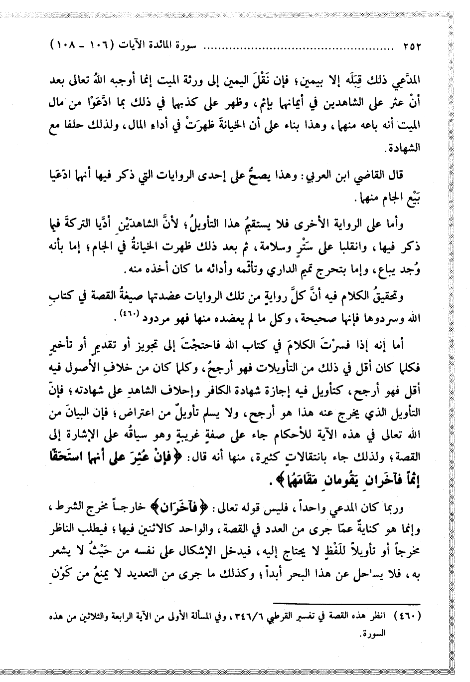 أَمَّا إنَّهُ إذَا فَسَّرْت الْكَلَامَ فِي كِتَابِ اللَّهِ فَاحْتَجْت إلَى تَجْوِيزٍ أَوْ تَقْدِيمٍ أَوْ تَأْخِيرٍ فَكُلَّمَا كَانَ أَقَلَّ فِي ذَلِكَ مِنْ التَّأْوِيلَاتِ فَهُوَ أَرْجَحُ، وَكُلَّمَا كَانَ مِنْ خِلَافِ الْأُصُولِ فِيهِ أَقَلَّ فَهُوَ أَرْجَحُ، كَتَأْوِيلٍ فِيهِ إجَازَةُ شَهَادَةِ الْكَافِرِ وَإِحْلَافُ الشَّاهِدِ عَلَى شَهَادَتِهِ؛ فَإِنَّ التَّأْوِيلَ الَّذِي يُخَرَّجُ عَنْهُ هَذَا هُوَ أَرْجَحُ، وَلَا يَسْلَمُ تَأْوِيلٌ مِنْ اعْتِرَاضٍ؛ فَإِنَّ الْبَيَانَ مِنْ اللَّهِ تَعَالَى فِي هَذِهِ الْآيَةِ لِلْأَحْكَامِ جَاءَ عَلَى صِفَةٍ غَرِيبَةٍ وَهُوَ سِيَاقُهُ عَلَى الْإِشَارَةِ إلَى الْقِصَّةِ؛ وَلِذَلِكَ جَاءَ بِانْتِقَالَاتٍ كَثِيرَةٍ، مِنْهَا أَنَّهُ قَالَ: {فَإِنْ عُثِرَ عَلَى أَنَّهُمَا اسْتَحَقَّا إِثْمًا فَآخَرَانِ يَقُومَانِ مَقَامَهُمَا} [المائدة: 107].