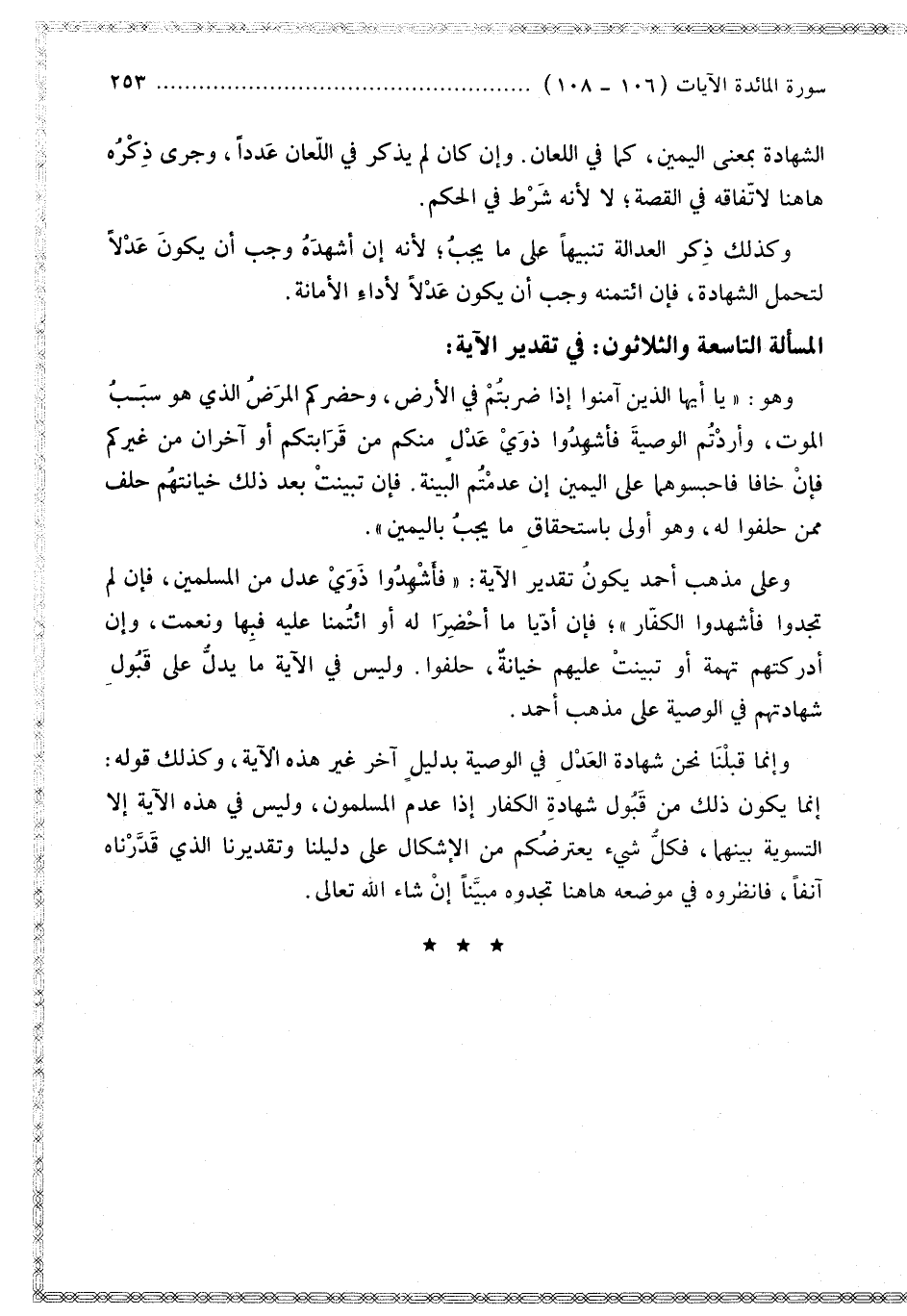 الْمَسْأَلَةُ التَّاسِعَةُ وَالثَّلَاثُونَ: فِي تَقْدِيرِ الْآيَةِ: وَهُوَ: " يَا أَيُّهَا الَّذِينَ آمَنُوا إذَا ضَرَبْتُمْ فِي الْأَرْضِ، وَحَضَرَكُمْ الْمَرَضُ الَّذِي هُوَ سَبَبُ الْمَوْتِ، وَأَرَدْتُمْ الْوَصِيَّةَ فَأَشْهِدُوا ذَوَيْ عَدْلٍ مِنْكُمْ مِنْ قَرَابَتِكُمْ أَوْ آخَرَانِ مِنْ غَيْرِكُمْ فَإِنْ خَافَا فَاحْبِسُوهُمَا عَلَى الْيَمِينِ إنْ عَدِمْتُمْ الْبَيِّنَةَ. فَإِنْ تَبَيَّنَتْ بَعْدَ ذَلِكَ خِيَانَتُهُمْ حَلَفَ مِمَّنْ حَلَفُوا لَهُ وَهُوَ أَوْلَى بِاسْتِحْقَاقِ مَا يَجِبُ بِالْيَمِينِ ".