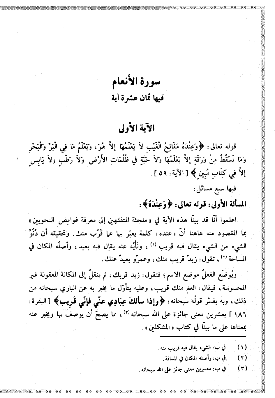 الْمَسْأَلَةُ الْأُولَى: قَوْله تَعَالَى: {وَعِنْدَهُ} [الأنعام: 59] اعْلَمُوا أَنَّا قَدْ بَيَّنَّا هَذِهِ الْآيَةَ فِي مُلْجِئَةِ الْمُتَفَقِّهِينَ إلَى مَعْرِفَةِ غَوَامِضِ النَّحْوِيِّينَ " بِمَا الْمَقْصُودُ مِنْهُ هَاهُنَا أَنَّ " عِنْدَهُ " كَلِمَةً يُعَبَّرُ بِهَا عَمَّا قَرُبَ مِنْك وَتَحْقِيقُهُ أَنَّ دُنُوَّ الشَّيْءِ مِنْ الشَّيْءِ يُقَالُ فِيهِ قَرِيبٌ، وَنَأْيُهُ عَنْهُ يُقَالُ فِيهِ بَعِيدٌ، وَأَصْلُهُ: الْمَكَانُ فِي الْمِسَاحَةِ، تَقُولُ: زَيْدٌ قَرِيبٌ مِنْك، وَعَمْرٌو بَعِيدٌ عَنْك.