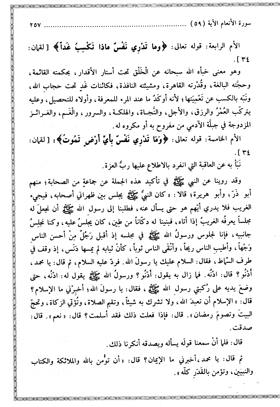 وَقَدْ رَوَيْنَا عَنْ النَّبِيِّ - صَلَّى اللَّهُ عَلَيْهِ وَسَلَّمَ - فِي تَأْكِيدِ هَذِهِ الْجُمْلَةِ عَنْ جَمَاعَةٍ مِنْ الصَّحَابَةِ؛ مِنْهُمْ أَبُو ذَرٍّ، وَأَبُو هُرَيْرَةَ؛ قَالَا: «كَانَ النَّبِيُّ - صَلَّى اللَّهُ عَلَيْهِ وَسَلَّمَ - يَجْلِسُ بَيْنَ ظَهْرَانِيْ أَصْحَابِهِ، فَيَجِيءُ الْغَرِيبُ فَلَا يَدْرِي أَيُّهُمْ هُوَ حَتَّى يَسْأَلَ عَنْهُ، فَطَلَبْنَا إلَى رَسُولِ اللَّهِ - صَلَّى اللَّهُ عَلَيْهِ وَسَلَّمَ - أَنْ نَجْعَلَ لَهُ مَجْلِسًا يَعْرِفُهُ الْغَرِيبُ إذَا أَتَاهُ، فَبَنَيْنَا لَهُ دُكَّانًا مِنْ طِينٍ، كَانَ يَجْلِسُ عَلَيْهِ، وَكُنَّا نَجْلِسُ جَانِبَيْهِ، فَإِنَّا لَجُلُوسٌ وَرَسُولُ اللَّهِ - صَلَّى اللَّهُ عَلَيْهِ وَسَلَّمَ - فِي مَجْلِسِهِ إذْ أَقْبَلَ رَجُلٌ مِنْ أَحْسَنِ النَّاسِ وَجْهًا، وَأَطْيَبِ النَّاسِ رِيحًا، وَأَنْقَى النَّاسِ ثَوْبًا، كَأَنَّ ثِيَابَهُ لَمْ يَمَسَّهَا دَنَسٌ، إذْ وَقَفَ فِي طَرَفِ السِّمَاطِ، فَقَالَ: السَّلَامُ عَلَيْك يَا رَسُولَ اللَّهِ. فَرَدَّ عَلَيْهِ السَّلَامَ ثُمَّ قَالَ: يَا مُحَمَّدُ، أَدْنُو؟ قَالَ: ادْنُهْ. فَمَا زَالَ بِهِ يَقُولُ: أَدْنُو؟ وَرَسُولُ اللَّهِ - صَلَّى اللَّهُ عَلَيْهِ وَسَلَّمَ - يَقُولُ لَهُ: ادْنُهْ، حَتَّى وَضَعَ يَدَيْهِ عَلَى رُكْبَتَيْ رَسُولِ اللَّهِ - صَلَّى اللَّهُ عَلَيْهِ وَسَلَّمَ - فَقَالَ: يَا رَسُولَ اللَّهِ؛ أَخْبِرْنِي مَا الْإِسْلَامُ؟ قَالَ: الْإِسْلَامُ أَنْ تَعْبُدَ اللَّهَ وَلَا تُشْرِكَ بِهِ شَيْئًا، وَتُقِيمَ الصَّلَاةَ، وَتُؤْتِيَ الزَّكَاةَ، وَتَحُجَّ الْبَيْتَ وَتَصُومَ رَمَضَانَ. قَالَ: فَإِذَا فَعَلْت ذَلِكَ فَقَدْ أَسْلَمْت؟ قَالَ: نَعَمْ. قَالَ: صَدَقْت. قَالَ: فَلَمَّا أَنْ سَمِعْنَا قَوْلَهُ يَسْأَلُهُ وَيُصَدِّقُهُ أَنْكَرْنَا ذَلِكَ. ثُمَّ قَالَ: يَا مُحَمَّدُ، أَخْبِرْنِي مَا الْإِيمَانُ؟ قَالَ: أَنْ تُؤْمِنَ بِاَللَّهِ وَالْمَلَائِكَةِ وَالْكِتَابِ وَالنَّبِيِّينَ، وَتُؤْمِنَ بِالْقَدَرِ كُلِّهِ.