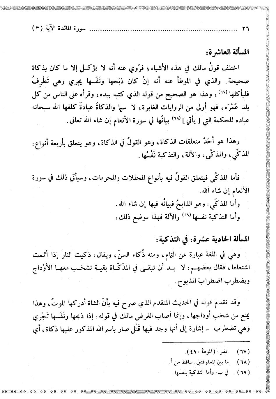 فَأَمَّا الْمُذَكَّى فَيَتَعَلَّقُ الْقَوْلُ فِيهِ بِأَنْوَاعِ الْمُحَلَّلَاتِ وَالْمُحَرَّمَاتِ، وَسَيَأْتِي ذَلِكَ فِي سُورَةِ الْأَنْعَامِ إنْ شَاءَ اللَّهُ. وَأَمَّا الْمُذَكِّي: وَهُوَ الذَّابِحُ فَبَيَانُهُ فِيهَا إنْ شَاءَ اللَّهُ.