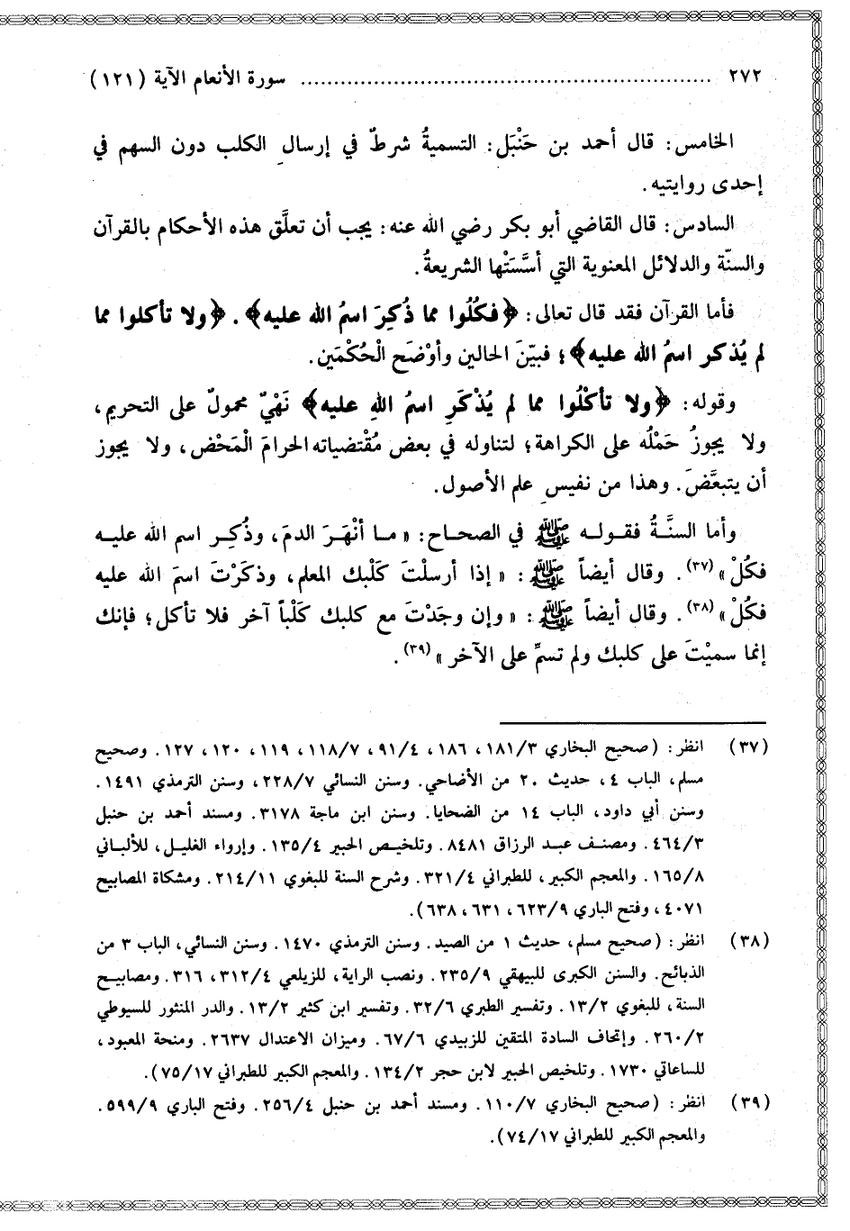 وَقَوْلُهُ: {وَلا تَأْكُلُوا مِمَّا لَمْ يُذْكَرِ اسْمُ اللَّهِ عَلَيْهِ} [الأنعام: 121] نَهْيٌ مَحْمُولٌ عَلَى التَّحْرِيمِ، وَلَا يَجُوزُ حَمْلُهُ عَلَى الْكَرَاهَةِ؛ لِتَنَاوُلِهِ فِي بَعْضِ مُقْتَضَيَاتِهِ الْحَرَامَ الْمَحْضَ، وَلَا يَجُوزُ أَنْ يَتَبَعَّضَ. وَهَذَا مِنْ نَفِيسِ عِلْمِ الْأُصُولِ.