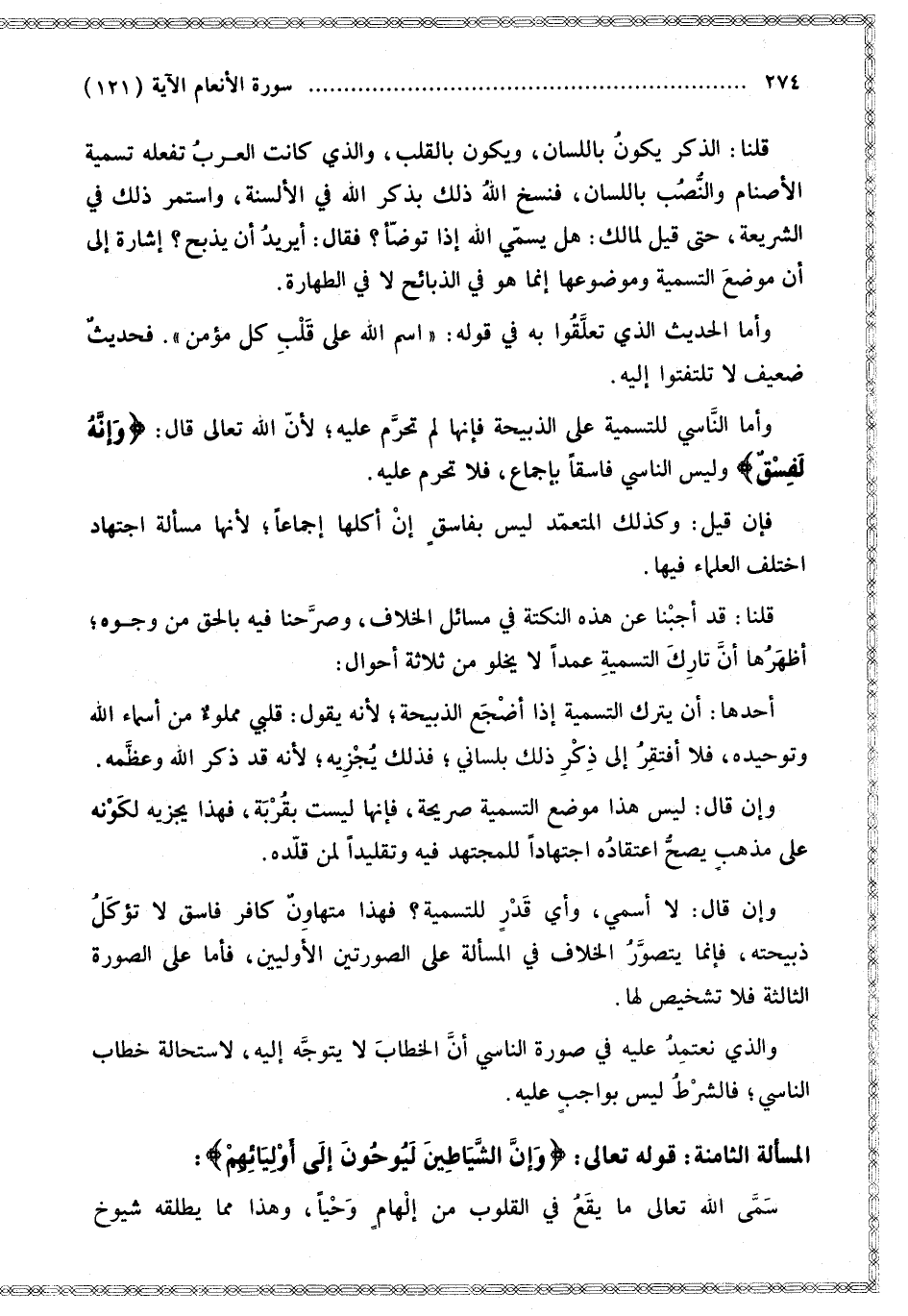 وَأَمَّا الْحَدِيثُ الَّذِي تَعَلَّقُوا بِهِ فِي قَوْلِهِ: «اسْمُ اللَّهِ عَلَى قَلْبِ كُلِّ مُؤْمِنٍ» فَحَدِيثٌ ضَعِيفٌ لَا تَلْتَفِتُوا إلَيْهِ. وَأَمَّا النَّاسِي لِلتَّسْمِيَةِ عَلَى الذَّبِيحَةِ فَإِنَّهَا لَمْ تُحَرَّمْ عَلَيْهِ؛ لِأَنَّ اللَّهَ تَعَالَى قَالَ: {وَإِنَّهُ لَفِسْقٌ} [الأنعام: 121] وَلَيْسَ النَّاسِي فَاسِقًا بِإِجْمَاعٍ، فَلَا تُحَرَّمُ عَلَيْهِ.