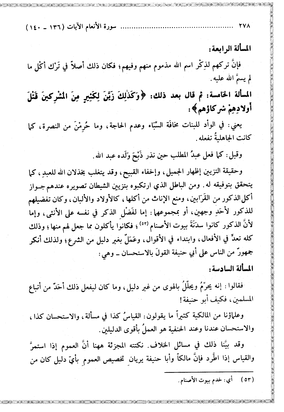 الْمَسْأَلَةُ الْخَامِسَةُ: ثُمَّ قَالَ بَعْدَ ذَلِكَ: {وَكَذَلِكَ زَيَّنَ لِكَثِيرٍ مِنَ الْمُشْرِكِينَ قَتْلَ أَوْلادِهِمْ شُرَكَاؤُهُمْ} [الأنعام: 137] يَعْنِي: فِي الْوَأْدِ لِلْبَنَاتِ مَخَافَةَ السِّبَاءِ وَعَدَمِ الْحَاجَةِ وَمَا حُرِمْنَ مِنْ النُّصْرَةِ، كَمَا كَانَتْ الْجَاهِلِيَّةُ تَفْعَلُهُ.