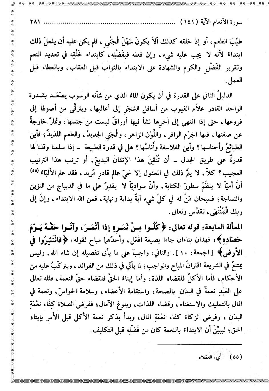 الْمَسْأَلَةُ السَّابِعَةُ: قَوْله تَعَالَى: {كُلُوا مِنْ ثَمَرِهِ إِذَا أَثْمَرَ وَآتُوا حَقَّهُ يَوْمَ حَصَادِهِ} [الأنعام: 141] فَهَذَانِ بِنَاءَانِ جَاءَا بِصِيغَةِ أَفْعَلَ، وَأَحَدُهُمَا مُبَاحٌ لِقَوْلِهِ: {فَانْتَشِرُوا فِي الأَرْضِ} [الجمعة: 10]. وَالثَّانِي: وَاجِبٌ عَلَى مَا يَأْتِي تَفْصِيلُهُ إنْ شَاءَ اللَّهُ، وَلَيْسَ يَمْتَنِعُ فِي الشَّرِيعَةِ اقْتِرَانُ الْمُبَاحِ وَالْوَاجِبِ؛ لِمَا يَأْتِي فِي ذَلِكَ مِنْ الْفَوَائِدِ، وَيَتَرَكَّبُ عَلَيْهِ مِنْ الْأَحْكَامِ، فَأَمَّا الْأَكْلُ فَلِقَضَاءِ اللَّذَّةِ، وَأَمَّا إيتَاءُ الْحَقِّ فَلِقَضَاءِ حَقِّ النِّعْمَةِ، فَلِلَّهِ تَعَالَى عَلَى الْعَبْدِ نِعْمَةٌ فِي الْبَدَنِ بِالصِّحَّةِ، وَاسْتِقَامَةِ الْأَعْضَاءِ، وَسَلَامَةِ الْحَوَاسِّ، وَنِعْمَةٌ فِي الْمَالِ بِالتَّمْلِيكِ وَالِاسْتِغْنَاءِ، وَقَضَاءِ اللَّذَّاتِ، وَبُلُوغِ الْآمَالِ؛ فَفَرْضُ الصَّلَاةِ كِفَاءُ نِعْمَةِ الْبَدَنِ، وَفَرْضُ الزَّكَاةِ كِفَاءُ نِعْمَةِ الْمَالِ، وَبَدَأَ بِذِكْرِ نِعْمَةِ الْأَكْلِ قَبْلَ الْأَمْرِ بِإِيتَاءِ الْحَقِّ؛ لِيُبَيِّنَ أَنَّ الِابْتِدَاءَ بِالنِّعْمَةِ كَانَ مِنْ فَضْلِهِ قَبْلَ التَّكْلِيفِ.