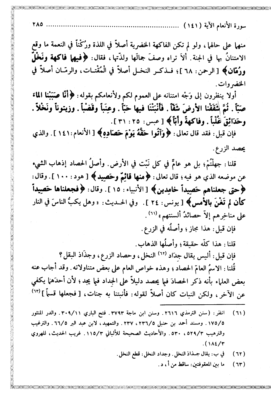 قُلْنَا: الِاسْمُ الْعَامُّ الْحَصَادُ؛ وَهَذِهِ خَوَاصُّ الْعَامِّ عَلَى بَعْضِ مُتَنَاوَلَاتِهِ. وَقَدْ أَجَابَ عَنْهُ بَعْضُ الْعُلَمَاءِ بِأَنَّهُ ذَكَرَ الْحَصَادَ فِيمَا يُحْصَدُ دَلِيلًا عَلَى الْجِدَادِ فِيمَا يُجَدُّ؛ لِأَنَّ أَحَدَهُمَا يَكْفِي عَنْ الْآخَرِ، وَلَكِنَّ النَّبَاتَ كَانَ أَصْلًا لِقَوْلِهِ: فَأَنْبَتْنَا بِهِ جَنَّاتٍ [فَجَعَلَهَا قِسْمًا]