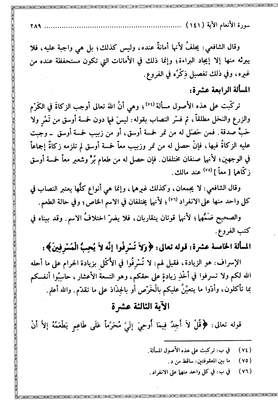 الْمَسْأَلَةُ الْخَامِسَةَ عَشْرَةَ: قَوْله تَعَالَى: {وَلا تُسْرِفُوا إِنَّهُ لا يُحِبُّ الْمُسْرِفِينَ} [الأنعام: 141] الْإِسْرَافُ: هُوَ الزِّيَادَةُ، فَقِيلَ لَهُمْ: لَا تُسْرِفُوا فِي الْأَكْلِ بِزِيَادَةِ الْحَرَامِ عَلَى مَا أَحَلَّهُ اللَّهُ لَكُمْ وَلَا تُسْرِفُوا فِي أَخْذِ زِيَادَةٍ عَلَى حَقِّكُمْ، وَهُوَ التِّسْعَةُ الْأَعْشَارُ، حَاسِبُوا أَنْفُسَكُمْ بِمَا تَأْكُلُونَ، وَأَدُّوا مَا يَتَعَيَّنُ عَلَيْكُمْ بِالْخَرْصِ أَوْ بِالْجِذَاذِ عَلَى مَا تَقَدَّمَ. وَاَللَّهُ أَعْلَمُ.