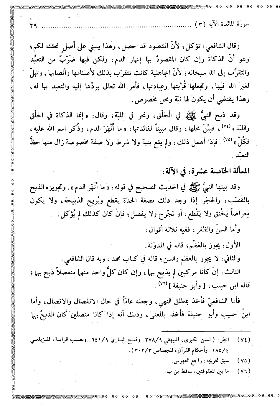 الْمَسْأَلَةُ الْخَامِسَةَ عَشْرَةَ: فِي الْآلَةِ: وَقَدْ بَيَّنَهَا النَّبِيُّ - صَلَّى اللَّهُ عَلَيْهِ وَسَلَّمَ - فِي الْحَدِيثِ الصَّحِيحِ فِي قَوْلِهِ: «مَا أَنْهَرَ الدَّمَ».