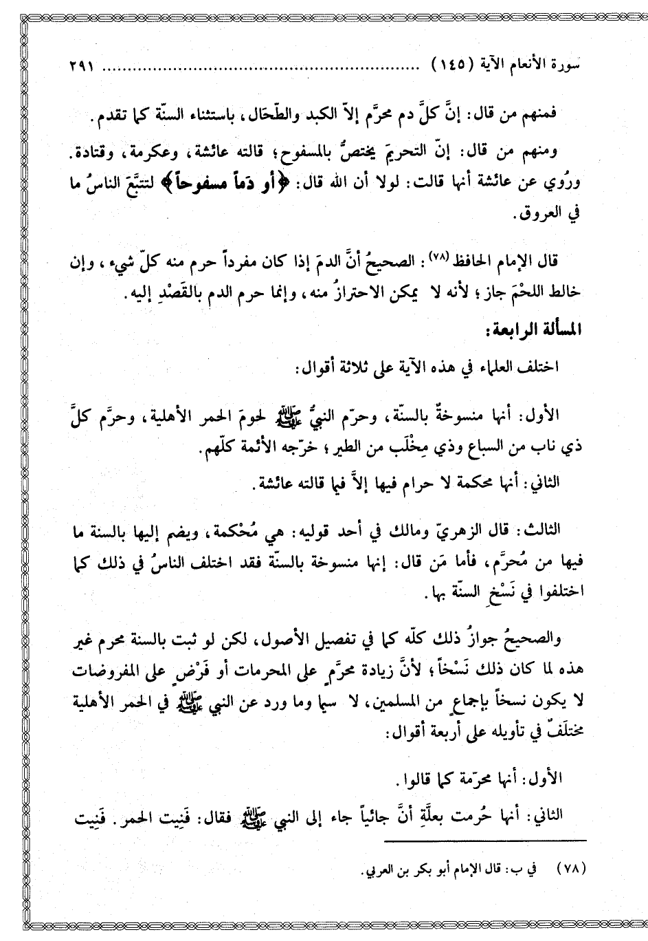 وَمِنْهُمْ مَنْ قَالَ: إنَّ التَّحْرِيمَ يَخْتَصُّ بِالْمَسْفُوحِ؛ قَالَتْهُ عَائِشَةُ، وَعِكْرِمَةُ، وَقَتَادَةُ.