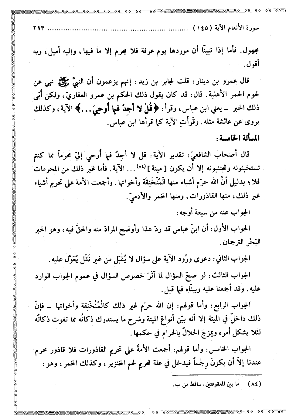 قَالَ أَصْحَابُ الشَّافِعِيِّ: تَقْدِيرُ الْآيَةِ: قُلْ لَا أَجِدُ فِيمَا أُوحِيَ إلَيَّ مُحَرَّمًا مِمَّا كُنْتُمْ تَسْتَخْبِثُونَهُ وَتَجْتَنِبُونَهُ إلَّا أَنْ يَكُونَ [مَيْتَةً] الْآيَةَ. فَأَمَّا غَيْرُ ذَلِكَ مِنْ الْمُحَرَّمَاتِ فَلَا؛ بِدَلِيلِ أَنَّ اللَّهَ حَرَّمَ أَشْيَاءَ مِنْهَا الْمُنْخَنِقَةُ وَأَخَوَاتُهَا. وَأَجْمَعَتْ الْأُمَّةُ عَلَى تَحْرِيمِ أَشْيَاءَ غَيْرِ ذَلِكَ، مِنْهَا الْقَاذُورَاتُ، وَمِنْهَا الْخَمْرُ وَالْآدَمِيُّ.
