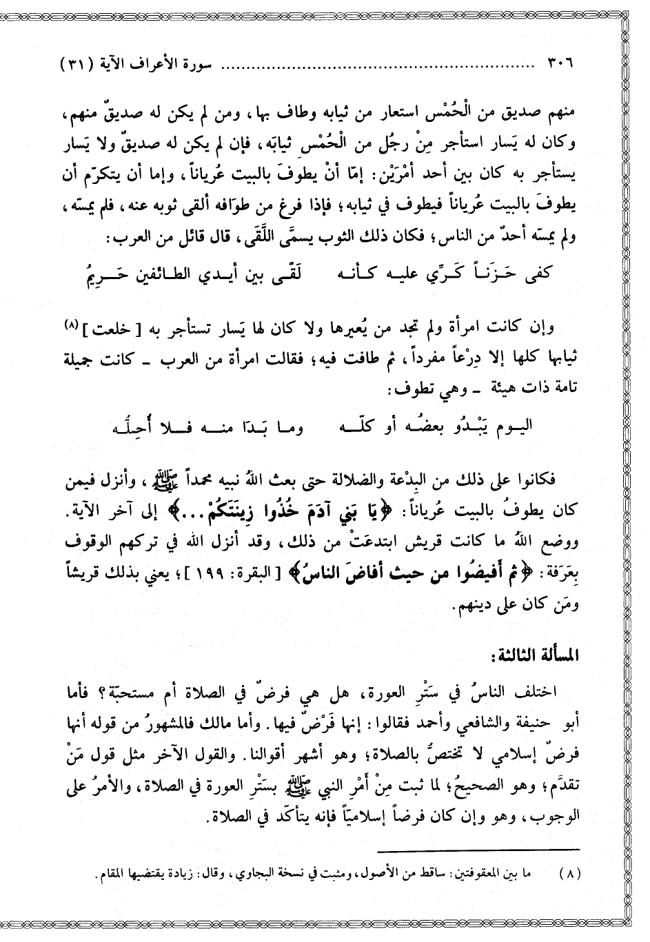 فَكَانُوا عَلَى ذَلِكَ مِنْ الْبِدْعَةِ وَالضَّلَالَةِ حَتَّى بَعَثَ اللَّهُ نَبِيَّهُ مُحَمَّدًا - صَلَّى اللَّهُ عَلَيْهِ وَسَلَّمَ - وَأَنْزَلَ فِيمَنْ كَانَ يَطُوفُ بِالْبَيْتِ عُرْيَانًا: {يَا بَنِي آدَمَ خُذُوا زِينَتَكُمْ} [الأعراف: 31] إلَى آخِرِ الْآيَةِ.