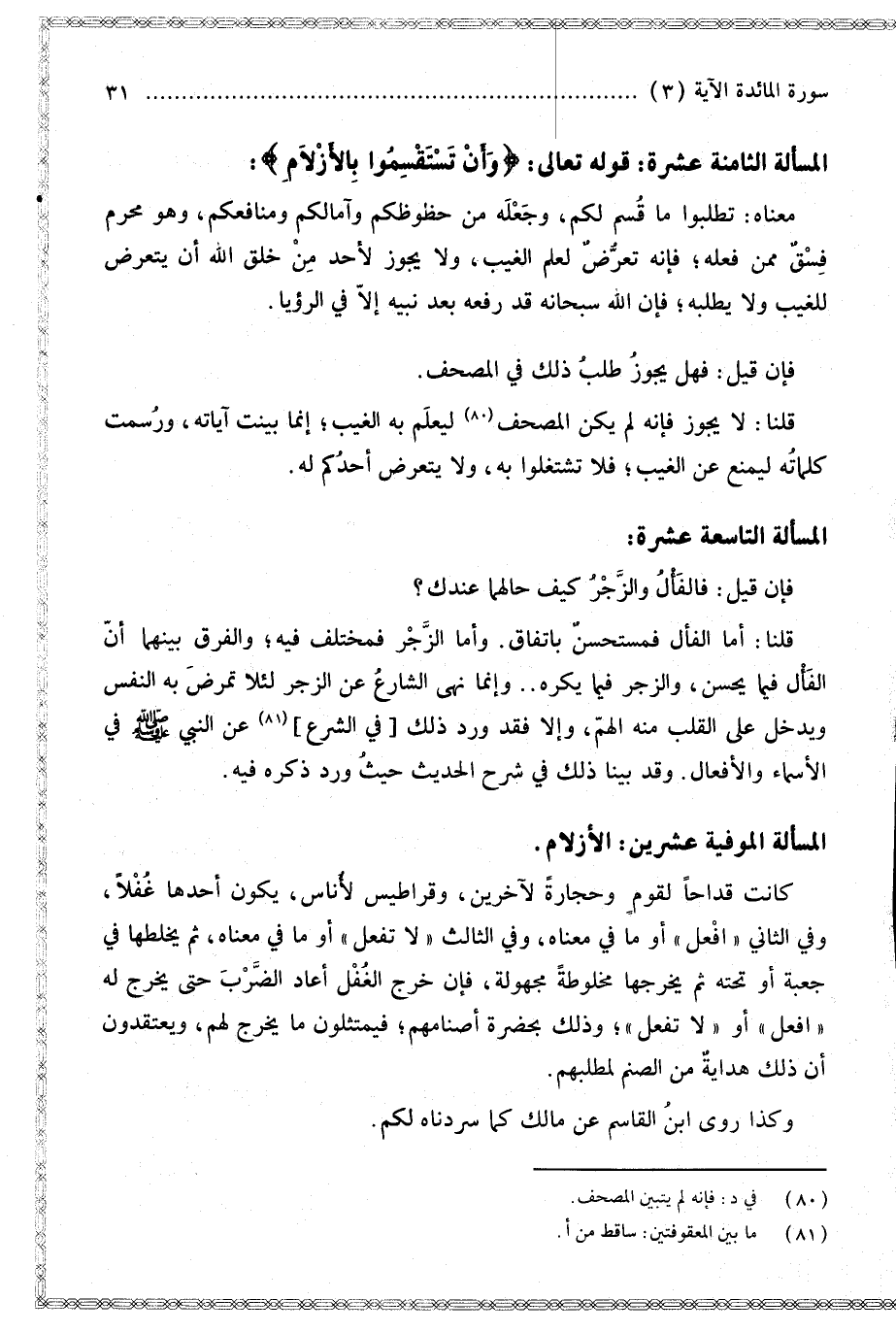 وَقَدْ بَيَّنَّا ذَلِكَ فِي شَرْحِ الْحَدِيثِ حَيْثُ وَرَدَ ذِكْرُهُ فِيهِ. الْمَسْأَلَةُ الْمُوفِيَةُ عِشْرِينَ: الْأَزْلَامِ. كَانَتْ قِدَاحًا لِقَوْمٍ وَحِجَارَةً لِآخَرِينَ، وَقَرَاطِيسَ لِأُنَاسٍ، يَكُونُ أَحَدُهَا غُفْلًا، وَفِي الثَّانِي " افْعَلْ " أَوْ مَا فِي مَعْنَاهُ، وَفِي الثَّالِثِ " لَا تَفْعَلْ " أَوْ مَا فِي مَعْنَاهُ، ثُمَّ يَخْلِطُهَا فِي جَعْبَةٍ أَوْ تَحْتَهُ ثُمَّ يُخْرِجُهَا مَخْلُوطَةً مَجْهُولَةً، فَإِنْ خَرَجَ الْغُفْلُ أَعَادَ الضَّرْبَ حَتَّى يَخْرُجَ لَهُ " افْعَلْ " أَوْ " لَا تَفْعَلْ " وَذَلِكَ بِحَضْرَةِ أَصْنَامِهِمْ؛ فَيَمْتَثِلُونَ مَا يَخْرُجُ لَهُمْ، وَيَعْتَقِدُونَ أَنَّ ذَلِكَ هِدَايَةٌ مِنْ الصَّنَمِ لِمَطْلَبِهِمْ.