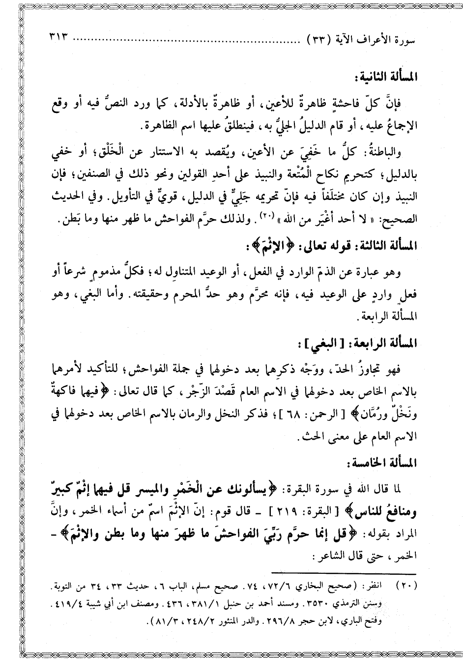 لَمَّا قَالَ اللَّهُ فِي سُورَةِ الْبَقَرَةِ: {يَسْأَلُونَكَ عَنِ الْخَمْرِ وَالْمَيْسِرِ قُلْ فِيهِمَا إِثْمٌ كَبِيرٌ وَمَنَافِعُ لِلنَّاسِ} [البقرة: 219] قَالَ قَوْمٌ: إنَّ الْإِثْمَ اسْمٌ مِنْ أَسْمَاءِ الْخَمْرِ، وَإِنَّ الْمُرَادَ بِقَوْلِهِ: {قُلْ إِنَّمَا حَرَّمَ رَبِّيَ الْفَوَاحِشَ مَا ظَهَرَ مِنْهَا وَمَا بَطَنَ وَالإِثْمَ} [الأعراف: 33] الْخَمْرَ، حَتَّى قَالَ الشَّاعِرُ: