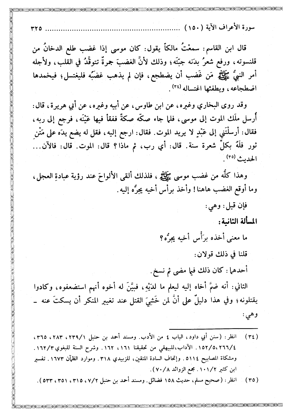 وَهَذَا كُلُّهُ مِنْ غَضَبِ مُوسَى - صَلَّى اللَّهُ عَلَيْهِ وَسَلَّمَ - فَلِذَلِكَ أَلْقَى الْأَلْوَاحَ عِنْدَ رُؤْيَةِ عِبَادَةِ الْعِجْلِ، وَمَا أَوْقَعَ الْغَضَبَ هَاهُنَا، وَأَخَذَ بِرَأْسِ أَخِيهِ يَجُرُّهُ إلَيْهِ.