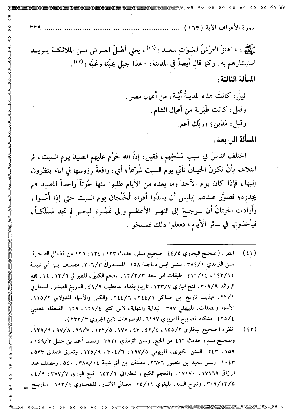 - صَلَّى اللَّهُ عَلَيْهِ وَسَلَّمَ - «اهْتَزَّ الْعَرْشُ لِمَوْتِ سَعْدٍ» يَعْنِي أَهْلَ الْعَرْشِ مِنْ الْمَلَائِكَةِ يُرِيدُ اسْتِبْشَارَهُمْ بِهِ. وَكَمَا قَالَ أَيْضًا فِي الْمَدِينَةِ: «هَذَا جَبَلٌ يُحِبُّنَا وَنُحِبُّهُ».