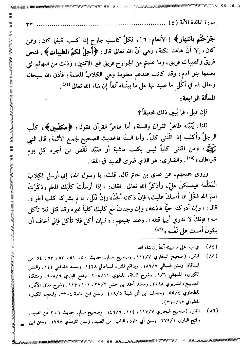فَكُلُّ كَاسِبٍ جَارِحٌ إذَا كَسَبَ كَيْفَمَا كَانَ، وَمِمَّنْ كَانَ، إلَّا أَنَّ هَاهُنَا نُكْتَةً، وَهِيَ أَنَّ اللَّهَ تَعَالَى قَالَ: {أُحِلَّ لَكُمُ الطَّيِّبَاتُ} [المائدة: 4]. فَنَحْنُ فَرِيقٌ وَالطَّيِّبَاتُ فَرِيقٌ، وَمَا عَلَّمْتُمْ مِنْ الْجَوَارِحِ فَرِيقٌ غَيْرُ الِاثْنَيْنِ، وَذَلِكَ مِنْ الْبَهَائِمِ الَّتِي يَعْلَمُهَا بَنُو آدَمَ، وَقَدْ كَانَتْ عِنْدَهُمْ مَعْلُومَةً وَهِيَ الْكِلَابُ الْمُعَلَّمَةُ؛ فَأَذِنَ اللَّهُ سُبْحَانَهُ وَتَعَالَى لَهُمْ فِي أَكْلِ مَا صِيدَ بِهَا عَلَى مَا بَيَّنَّاهُ آنِفًا إنْ شَاءَ اللَّهُ تَعَالَى. الْمَسْأَلَةُ الرَّابِعَةُ: فَإِنْ قِيلَ: فَمَا يُبَيِّنُ ذَلِكَ تَحْقِيقًا؟ قُلْنَا: يُبَيِّنُهُ ظَاهِرُ الْقُرْآنِ وَالسُّنَّةِ؛ أَمَّا ظَاهِرُ الْقُرْآنِ فَقَوْلُهُ: {مُكَلِّبِينَ} [المائدة: 4]، كَلَّبَ الرَّجُلُ وَأَكْلَبَ إذَا اقْتَنَى كَلْبًا.