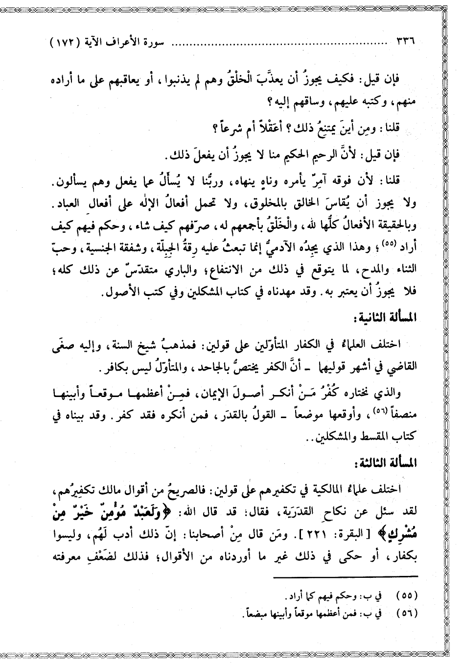 فَإِنْ قِيلَ: فَكَيْفَ يَجُوزُ أَنْ يُعَذَّبَ الْخَلْقُ وَهُمْ لَمْ يُذْنِبُوا، أَوْ يُعَاقِبُهُمْ عَلَى مَا أَرَادَهُ مِنْهُمْ، وَكَتَبَهُ عَلَيْهِمْ، وَسَاقَهُمْ إلَيْهِ؟ قُلْنَا: وَمِنْ أَيْنَ يَمْتَنِعُ ذَلِكَ؟ أَعَقْلًا أَمْ شَرْعًا؟ فَإِنْ قِيلَ: لِأَنَّ الرَّحِيمَ الْحَكِيمَ مِنَّا لَا يَجُوزُ أَنْ يَفْعَلَ ذَلِكَ.