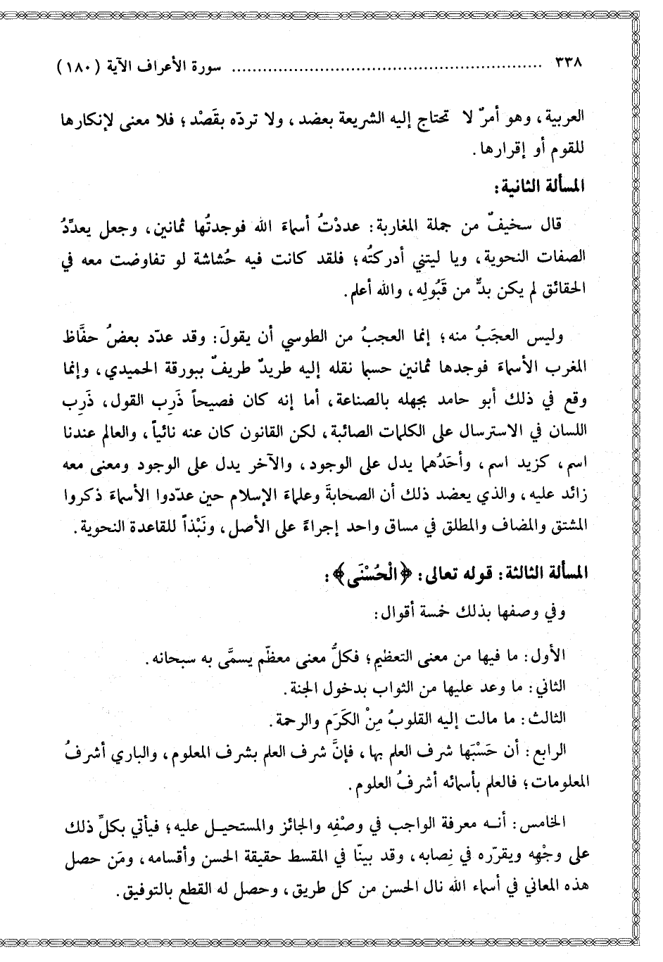 الْخَامِسُ: أَنَّهُ مَعْرِفَةُ الْوَاجِبِ فِي وَصْفِهِ وَالْجَائِزِ وَالْمُسْتَحِيلِ عَلَيْهِ؛ فَيَأْتِي بِكُلِّ ذَلِكَ عَلَى وَجْهِهِ وَيُقَرِّرُهُ فِي نِصَابِهِ، وَقَدْ بَيَّنَّا فِي الْمُقْسِطِ حَقِيقَةَ الْحُسْنِ وَأَقْسَامَهُ، وَمَنْ حَصَّلَ هَذِهِ الْمَعَانِيَ فِي أَسْمَاءِ اللَّهِ نَالَ الْحُسْنَ مِنْ كُلِّ طَرِيقٍ، وَحَصَلَ لَهُ الْقَطْعُ بِالتَّوْفِيقِ.