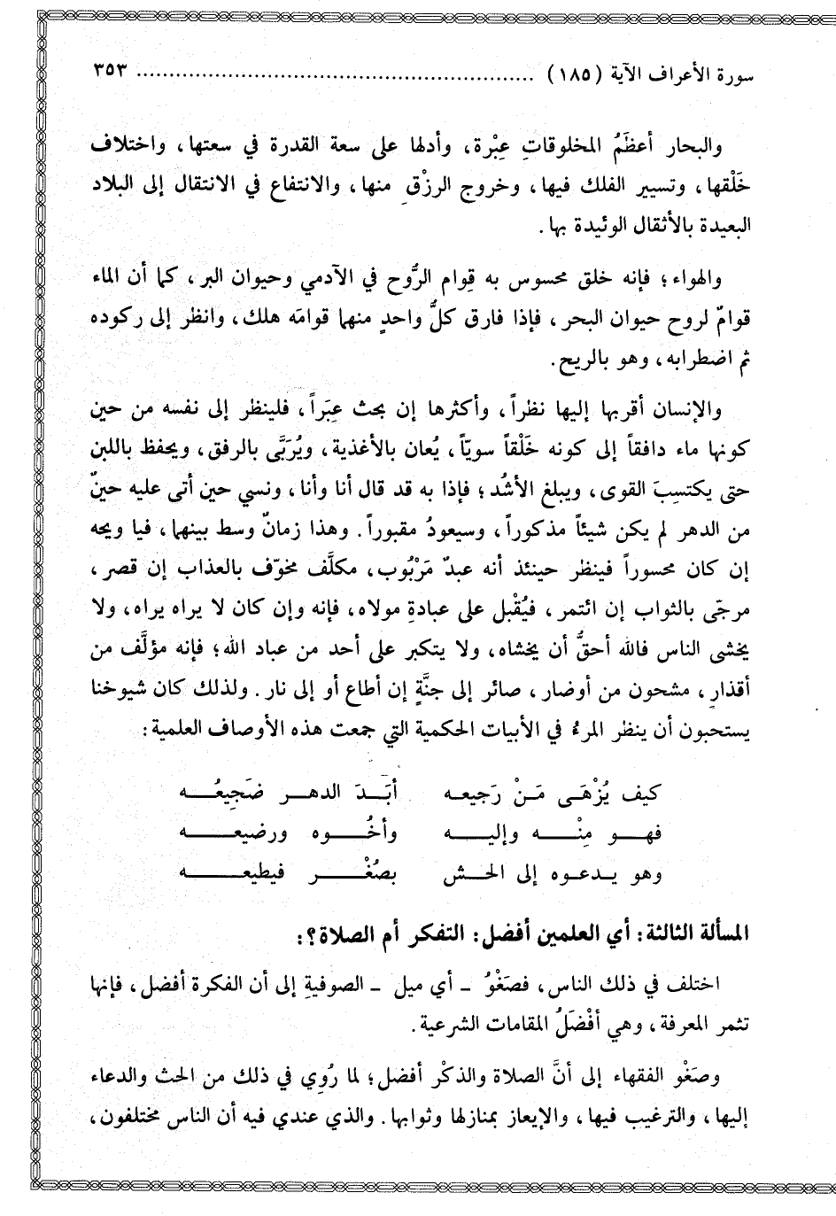 الْمَسْأَلَةُ الثَّالِثَةُ: أَيُّ الْعَمَلَيْنِ أَفْضَلُ: التَّفَكُّرُ أَمْ الصَّلَاةُ؟: اخْتَلَفَ فِي ذَلِكَ النَّاسُ، فَصَغْوُ أَيْ مَيْلُ الصُّوفِيَّةِ إلَى أَنَّ الْفِكْرَةَ أَفْضَلُ، فَإِنَّهَا تُثْمِرُ الْمَعْرِفَةَ، وَهِيَ أَفْضَلُ الْمَقَامَاتِ الشَّرْعِيَّةِ.
