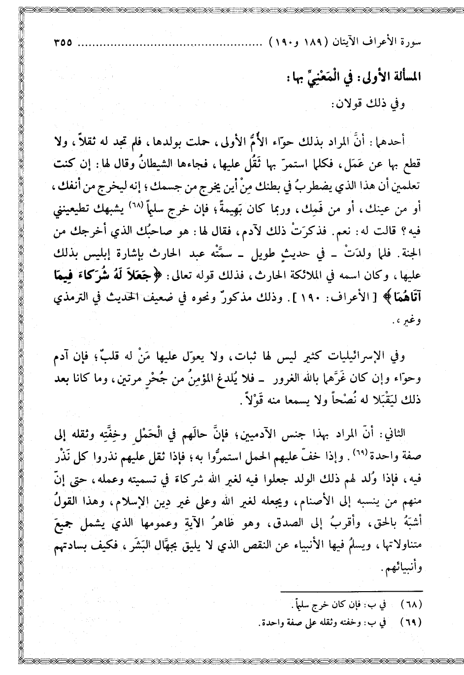 أَحَدُهُمَا: أَنَّ الْمُرَادَ بِذَلِكَ «حَوَّاءُ الْأُمُّ الْأُولَى، حَمَلَتْ بِوَلَدِهَا، فَلَمْ تَجِدْ لَهُ ثِقَلًا، وَلَا قَطَعَ بِهَا عَنْ عَمَلٍ، فَكُلَّمَا اسْتَمَرَّ بِهَا ثَقُلَ عَلَيْهَا، فَجَاءَهَا الشَّيْطَانُ وَقَالَ لَهَا: إنْ كُنْت تَعْلَمِينَ أَنَّ هَذَا الَّذِي يَضْطَرِبُ فِي بَطْنِك مِنْ أَيْنَ يَخْرُجُ مِنْ جِسْمِك؛ إنَّهُ لَيَخْرُجُ مِنْ أَنْفِك، أَوْ مِنْ عَيْنِك، أَوْ مِنْ فَمِك، وَرُبَّمَا كَانَ بَهِيمَةً؛ فَإِنْ خَرَجَ سَلِيمًا يُشْبِهُك تُطِيعِينَنِي فِيهِ؟ قَالَتْ لَهُ: نَعَمْ. فَذَكَرَتْ ذَلِكَ لِآدَمَ، فَقَالَ لَهَا: هُوَ صَاحِبُك الَّذِي أَخْرَجَك مِنْ الْجَنَّةِ. فَلَمَّا وَلَدَتْ فِي حَدِيثٍ طَوِيلٍ سَمَّتْهُ عَبْدَ الْحَارِثِ بِإِشَارَةِ إبْلِيسَ بِذَلِكَ عَلَيْهَا، وَكَانَ اسْمُهُ فِي الْمَلَائِكَةِ الْحَارِثَ، فَذَلِكَ قَوْله تَعَالَى: {جَعَلا لَهُ شُرَكَاءَ فِيمَا آتَاهُمَا} [الأعراف: 190].» وَذَلِكَ مَذْكُورٌ وَنَحْوُهُ فِي ضَعِيفِ الْحَدِيثِ فِي التِّرْمِذِيِّ وَغَيْرِهِ.