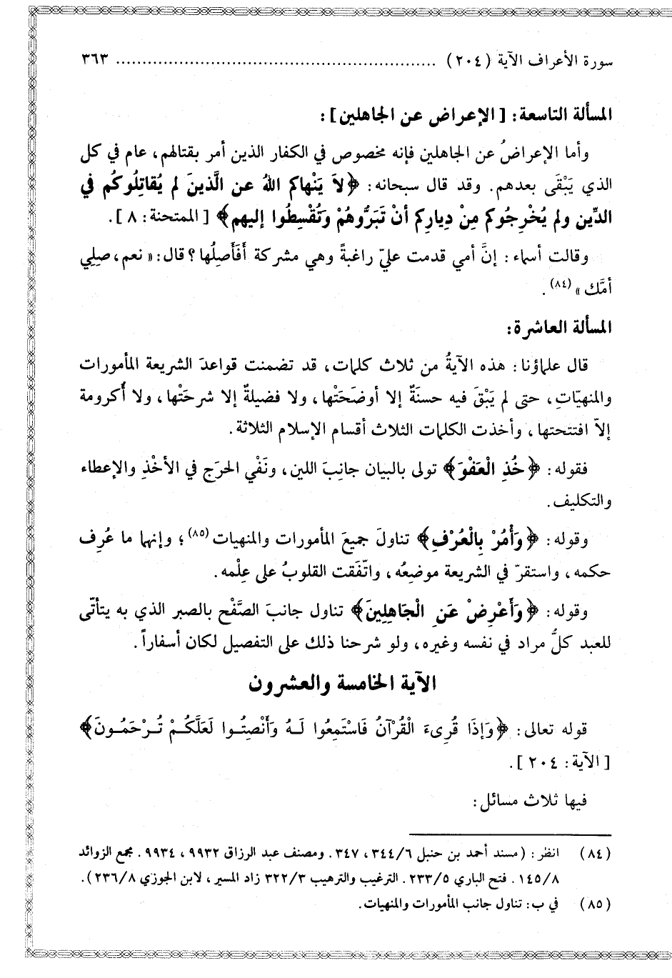 الْمَسْأَلَةُ التَّاسِعَةُ: الْإِعْرَاضُ عَنْ الْجَاهِلِينَ: وَأَمَّا الْإِعْرَاضُ عَنْ الْجَاهِلِينَ فَإِنَّهُ مَخْصُوصٌ فِي الْكُفَّارِ الَّذِينَ أُمِرَ بِقِتَالِهِمْ، عَامٌّ فِي كُلِّ الَّذِي يَبْقَى بَعْدَهُمْ. وَقَدْ قَالَ سُبْحَانَهُ: {لا يَنْهَاكُمُ اللَّهُ عَنِ الَّذِينَ لَمْ يُقَاتِلُوكُمْ فِي الدِّينِ وَلَمْ يُخْرِجُوكُمْ مِنْ دِيَارِكُمْ أَنْ تَبَرُّوهُمْ وَتُقْسِطُوا إِلَيْهِمْ} [الممتحنة: 8].