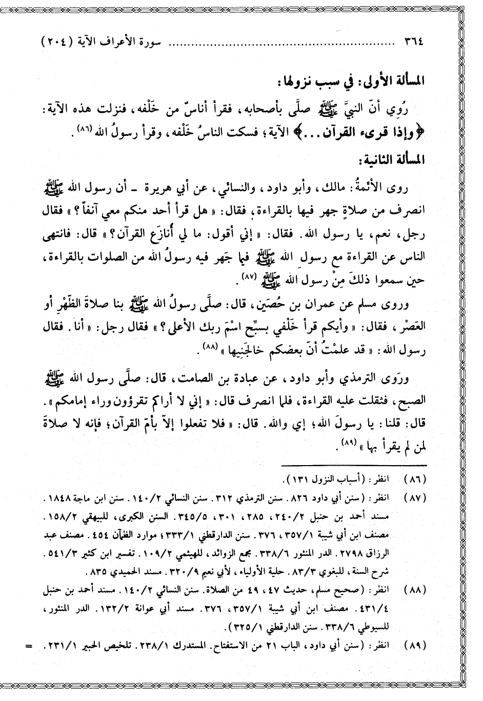 الْمَسْأَلَةُ الثَّانِيَةُ: رَوَى الْأَئِمَّةُ: مَالِكٌ، وَأَبُو دَاوُد، وَالنَّسَائِيُّ عَنْ أَبِي هُرَيْرَةَ «أَنَّ رَسُولَ اللَّهِ - صَلَّى اللَّهُ عَلَيْهِ وَسَلَّمَ - انْصَرَفَ مِنْ صَلَاةٍ جُهِرَ فِيهَا بِالْقِرَاءَةِ، فَقَالَ: هَلْ قَرَأَ أَحَدٌ مِنْكُمْ مَعِي آنِفًا؟ فَقَالَ رَجُلٌ، نَعَمْ، يَا رَسُولَ اللَّهِ. فَقَالَ: إنِّي أَقُولُ: مَا لِي أُنَازَعُ الْقُرْآنَ؟ قَالَ: فَانْتَهَى النَّاسُ عَنْ الْقِرَاءَةِ مَعَ رَسُولِ اللَّهِ - صَلَّى اللَّهُ عَلَيْهِ وَسَلَّمَ - فِيمَا جَهَرَ فِيهِ رَسُولُ اللَّهِ مِنْ الصَّلَوَاتِ بِالْقِرَاءَةِ، حِينَ سَمِعُوا ذَلِكَ مِنْ رَسُولِ اللَّهِ - صَلَّى اللَّهُ عَلَيْهِ وَسَلَّمَ -.»