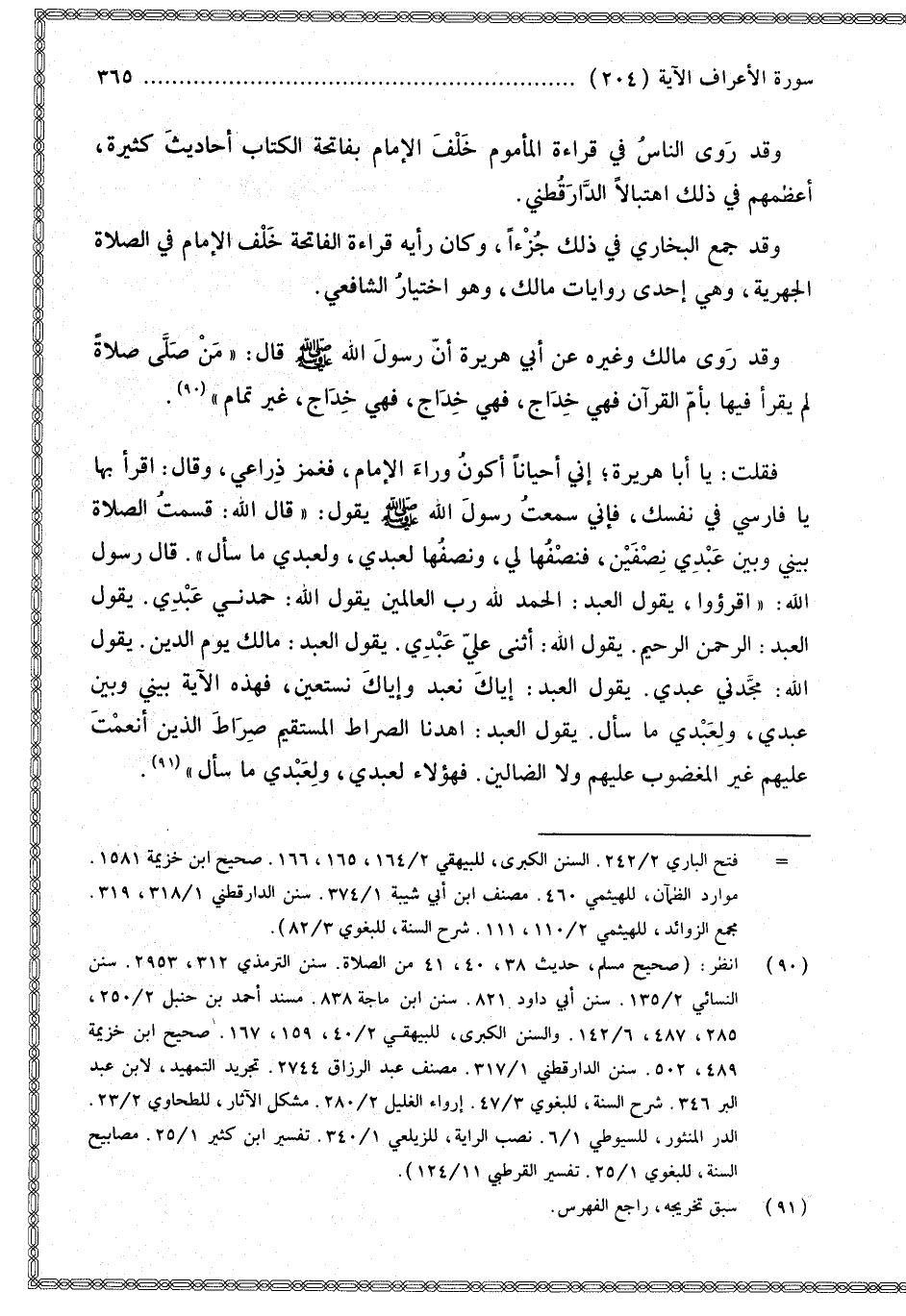 وَقَدْ رَوَى النَّاسُ فِي قِرَاءَةِ الْمَأْمُومِ خَلْفَ الْإِمَامِ بِفَاتِحَةِ الْكِتَابِ أَحَادِيثَ كَثِيرَةً، أَعْظَمُهُمْ فِي ذَلِكَ اهْتِبَالًا الدَّارَقُطْنِيُّ.