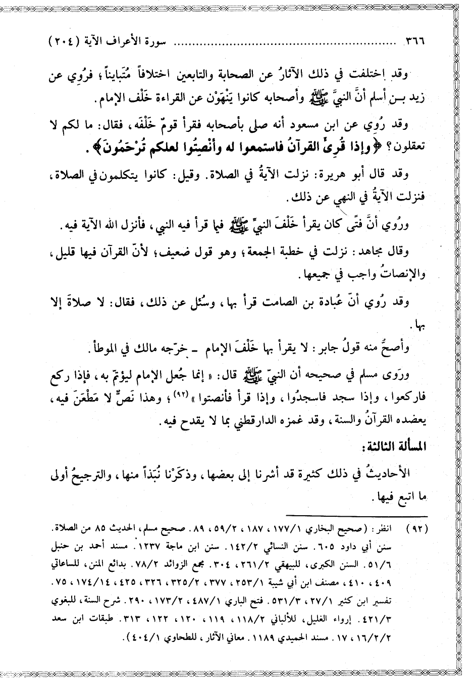 وَرَوَى مُسْلِمٌ فِي صَحِيحِهِ أَنَّ النَّبِيَّ - صَلَّى اللَّهُ عَلَيْهِ وَسَلَّمَ - قَالَ: «إنَّمَا جُعِلَ الْإِمَامُ لِيُؤْتَمَّ بِهِ، فَإِذَا رَكَعَ فَارْكَعُوا، وَإِذَا سَجَدَ فَاسْجُدُوا، وَإِذَا قَرَأَ فَأَنْصِتُوا»؛ وَهَذَا نَصٌّ لَا مَطْعَنَ فِيهِ، يُعَضِّدُهُ الْقُرْآنُ وَالسُّنَّةُ، وَقَدْ غَمَزَهُ الدَّارَقُطْنِيُّ بِمَا لَا يَقْدَحُ فِيهِ.